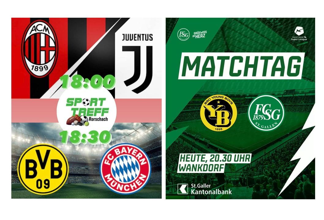 Heute Samstag ist man ab 18 Uhr im Rorschacher SportTreff beim Bahnübergang an der Signalstrasse in Rorschach gut aufgehoben. Zeitlich passt sogar noch ein Besuch auf Kellen für das Spiel zwischen dem FC RG 17 und dem FC Balzers. In Tübach geht es um 16 Uhr los.