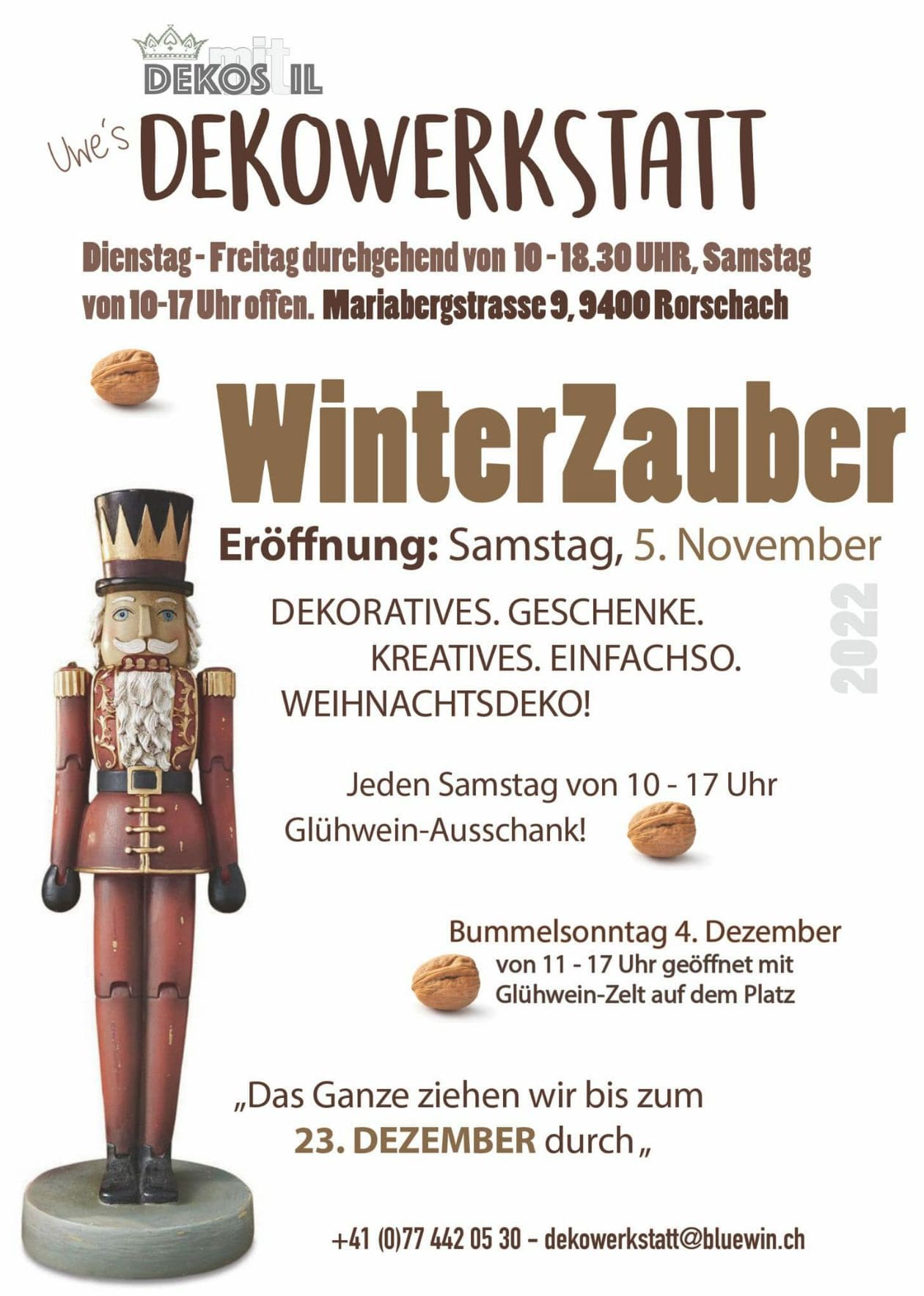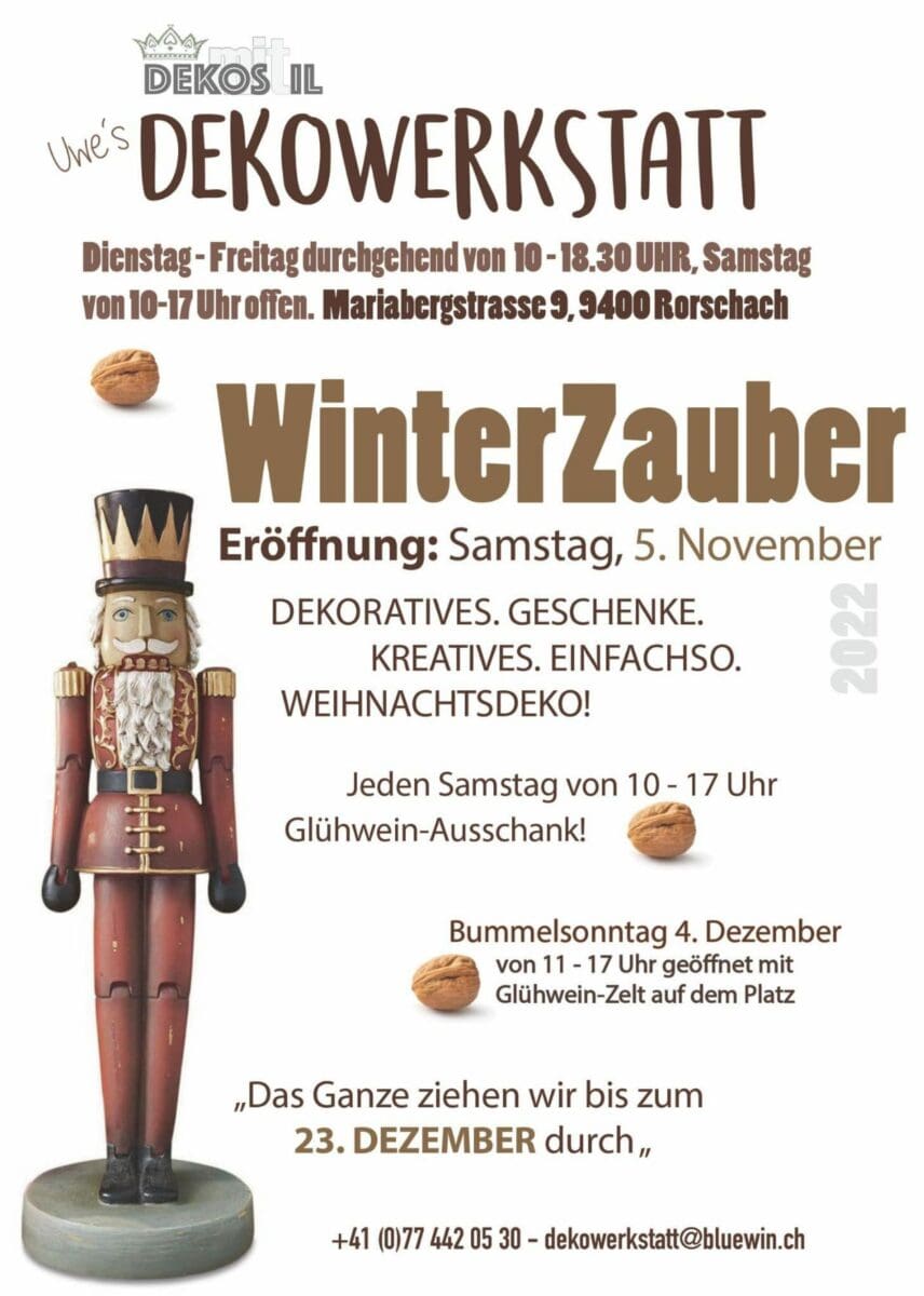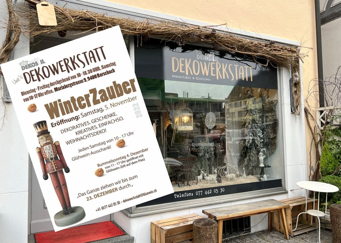 Uwe’s Winterzauber in seiner DekowerkstattThemen:KulturRorschach 15. Oktober 2022 - 05:05Die Dekowerkstatt an der Mariabergstrasse 9 ist Dienstag bis Freitag von 10 bis 18.30 Uhr und samstags von 10 bis 17 Uhr offen. Der WinterZauber startet am Samstag, 5. November 2022.Flyer: pd cb/urTeilen mit: Einen Link per E-Mail an einen Freund senden (Wird in neuem Fenster geöffnet) E-Mail Drucken (Wird in neuem Fenster geöffnet) Drucken Auf Facebook teilen (Wird in neuem Fenster geöffnet) Facebook Auf X teilen (Wird in neuem Fenster geöffnet) X Auf WhatsApp teilen (Wird in neuem Fenster geöffnet) WhatsApp Gefällt mir:Gefällt mir Wird geladen …Newsletter abonnieren Bitte dieses Feld leer lassenBitte wähle, ob Du über jeden neuen Beitrag sofort oder lieber jeden Morgen gegen 9 Uhr eine Zusammenfassung der neusten Beiträge erhalten möchtest.Liste(n) auswählen: Neues vom Echo (Zusammenfassung) Neues vom Echo (Sofortbenachrichtigung) Dieses Feld wird benötigt.Prüfen Sie Ihren Posteingang und den Spamordner, um Ihr Abonnement zu bestätigen.