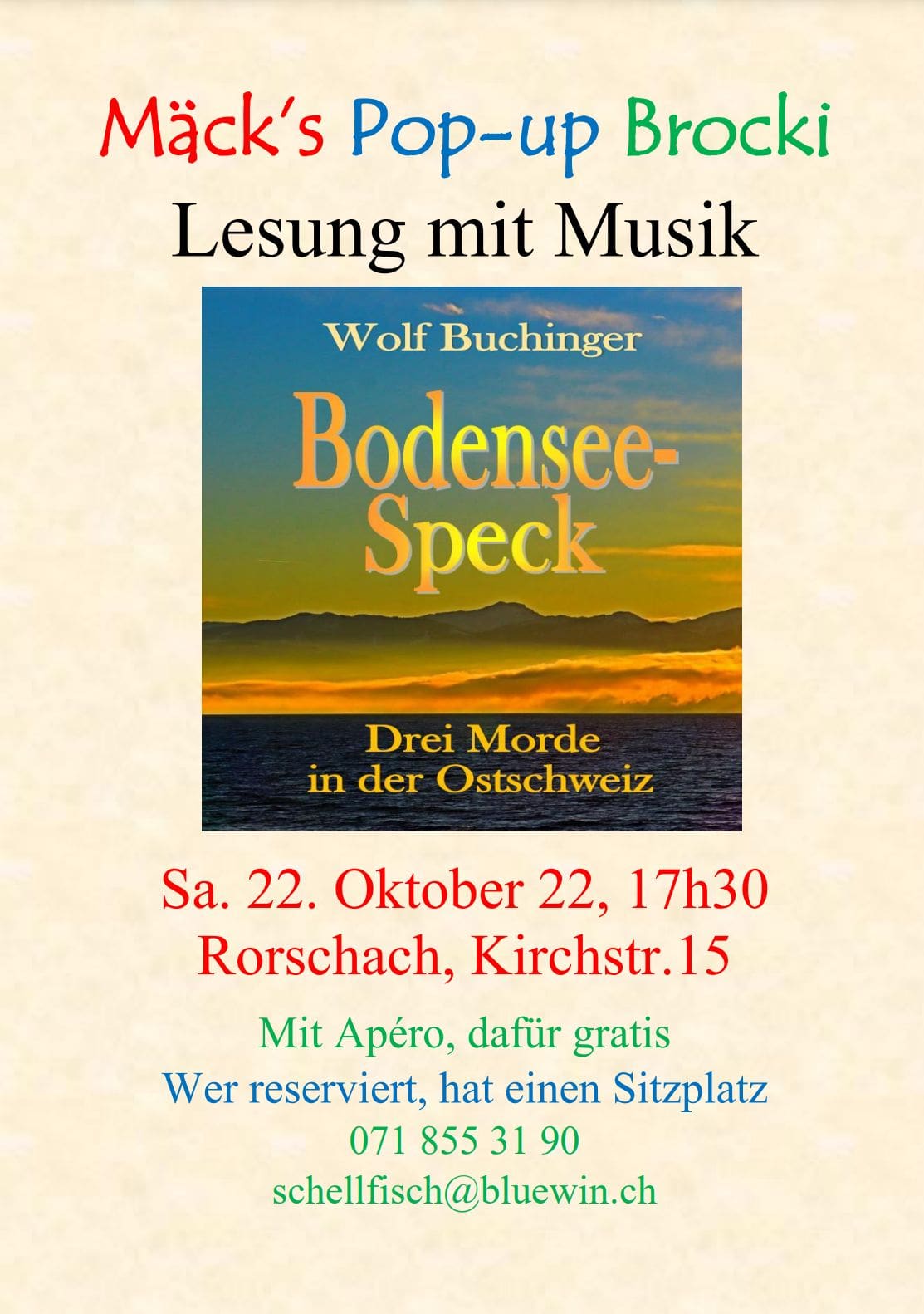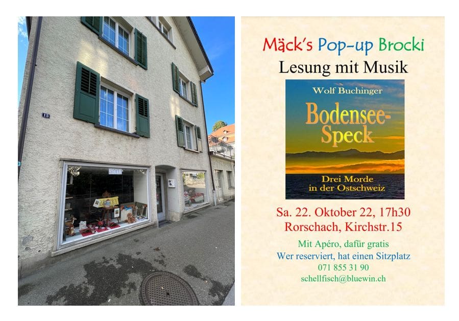 Buch „Bodensee-Speck“ wird in Rorschach vorgestelltThemen:KulturRorschach 20. Oktober 2022 - 06:03Wolf Buchinger liest kommenden Samstag an der Kirchstrasse 15 in Rorschach. Das Buch spielt im Dunstfeld zwischen Rorschach und Goldach, wobei die Namen natürlich geändert sind… Wer reserviert hat einen Sitzplatz. Details auf dem Flyer.Teilen mit: Klicken, um einem Freund einen Link per E-Mail zu senden (Wird in neuem Fenster geöffnet) E-Mail Klicken zum Ausdrucken (Wird in neuem Fenster geöffnet) Drucken Klick, um auf Facebook zu teilen (Wird in neuem Fenster geöffnet) Facebook Klicke, um auf X zu teilen (Wird in neuem Fenster geöffnet) X Klicken, um auf WhatsApp zu teilen (Wird in neuem Fenster geöffnet) WhatsApp Gefällt mir:Gefällt mir Wird geladen …Newsletter abonnieren Bitte dieses Feld leer lassenBitte wähle, ob Du über jeden neuen Beitrag sofort oder lieber jeden Morgen gegen 9 Uhr eine Zusammenfassung der neusten Beiträge erhalten möchtest.Liste(n) auswählen: Neues vom Echo (Zusammenfassung) Neues vom Echo (Sofortbenachrichtigung) Dieses Feld wird benötigt.Prüfen Sie Ihren Posteingang und den Spamordner, um Ihr Abonnement zu bestätigen.