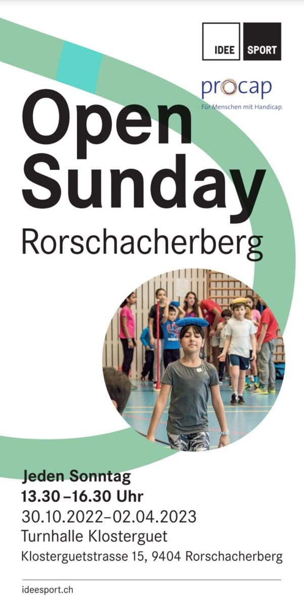 Sonntags vom 30. Oktober 2022 bis 2. April 2023, jeweils 13:30 bis 16:30 Uhr im Turnhallengebäude der Schule Klosterguet. Keine Veranstaltung während der Weihnachts- und Sportferien. Mehr Infos unter: https://www.ideesport.ch/projekte/opensunday-rorschacherberg/