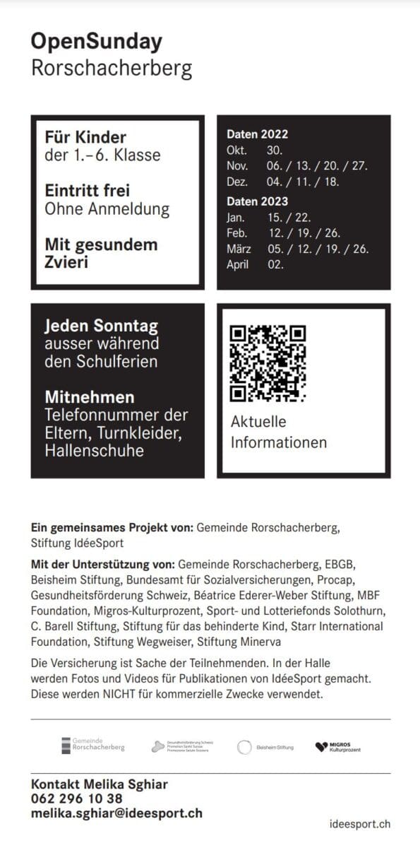 Nach einem sehr heissen und sonnigen Sommer folgte ein bunt-goldener Herbst mit milden Temperaturen. Und doch werden mittlerweile die Tage konstant kürzer und die kalt-nasse Jahreszeit steht unmittelbar vor unserer Haustür. Damit die Spiel- und Bewegungsfreude der Kinder im Rorschacherberg nicht unter den kühleren Monaten leiden muss, gibt es auch diese Saison ein darauf zugeschnittenes Bewegungsprogramm. Das Kinderprojekt OpenSunday, das in Zusammenarbeit der Gemeinde Rorschacherberg mit der Stiftung IdéeSport besteht, wird auch diese Saison wieder die Türen zur Sporthalle Klosterguet öffnen. Ab dem 30. Oktober 2022 bis zum 2. April 2023 können sich die Primarschüler*innen aus dem Rorschacherberg an 18 Veranstaltungen jeweils sonntags kostenlos austoben und sportlich betätigen. Die Turnhalle wird jeden Sonntagnachmittag von 13:30 bis 16:30 Uhr geöffnet. Eine Anmeldung ist nicht erforderlich. Mitzubringen sind Sportkleidung, Hallenschuhe sowie die Telefonnummer der Eltern.