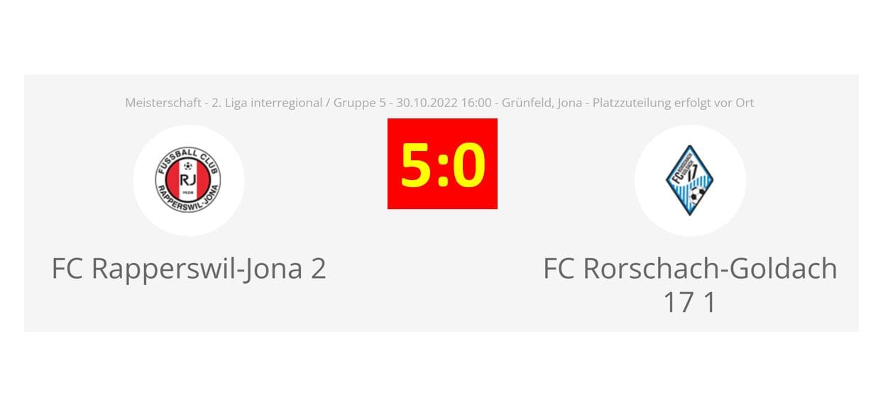 Nun hat es den FC RG 17 auch auswärts erwischt…Themen:FC RG 17 30. Oktober 2022 - 17:51Kein Glück für das Team von Olaf Sager heute Nachmittag in Rapperswil. Am Schluss hiess es klar und deutlich 5:0 (2:0). Man darf gespannt auf den Matchbericht von Pfütz Keel sein. Dieser wird morgen Montag nachgeliefert.Teilen mit: Einen Link per E-Mail an einen Freund senden (Wird in neuem Fenster geöffnet) E-Mail Drucken (Wird in neuem Fenster geöffnet) Drucken Auf Facebook teilen (Wird in neuem Fenster geöffnet) Facebook Auf X teilen (Wird in neuem Fenster geöffnet) X Auf WhatsApp teilen (Wird in neuem Fenster geöffnet) WhatsApp Gefällt mir:Gefällt mir Wird geladen …Newsletter abonnieren Bitte dieses Feld leer lassenBitte wähle, ob Du über jeden neuen Beitrag sofort oder lieber jeden Morgen gegen 9 Uhr eine Zusammenfassung der neusten Beiträge erhalten möchtest.Liste(n) auswählen: Neues vom Echo (Zusammenfassung) Neues vom Echo (Sofortbenachrichtigung) Dieses Feld wird benötigt.Prüfen Sie Ihren Posteingang und den Spamordner, um Ihr Abonnement zu bestätigen.
