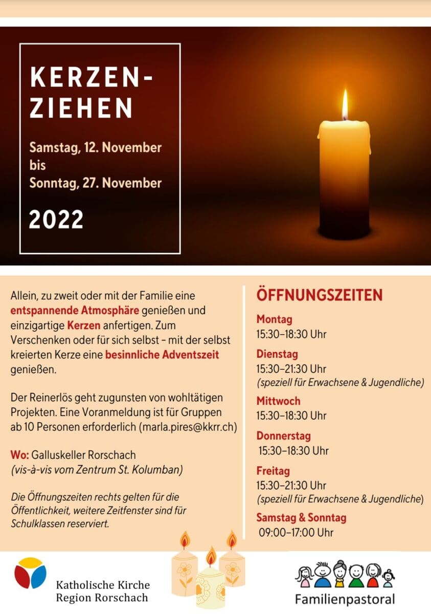 Die grosse Werbeplache ist nicht zu übersehen…Themen:Kath. RorschachKulturPartnerRorschach 6. November 2022 - 05:18Kommenden Samstag beginnt in Rorschach das traditionelle Kerzenziehen. Die wichtigsten Infos findet man auf dem Flyer unten. Teilen mit: Einen Link per E-Mail an einen Freund senden (Wird in neuem Fenster geöffnet) E-Mail Drucken (Wird in neuem Fenster geöffnet) Drucken Auf Facebook teilen (Wird in neuem Fenster geöffnet) Facebook Auf X teilen (Wird in neuem Fenster geöffnet) X Auf WhatsApp teilen (Wird in neuem Fenster geöffnet) WhatsApp Gefällt mir:Gefällt mir Wird geladen …Newsletter abonnieren Bitte dieses Feld leer lassenBitte wähle, ob Du über jeden neuen Beitrag sofort oder lieber jeden Morgen gegen 9 Uhr eine Zusammenfassung der neusten Beiträge erhalten möchtest.Liste(n) auswählen: Neues vom Echo (Zusammenfassung) Neues vom Echo (Sofortbenachrichtigung) Dieses Feld wird benötigt.Prüfen Sie Ihren Posteingang und den Spamordner, um Ihr Abonnement zu bestätigen.