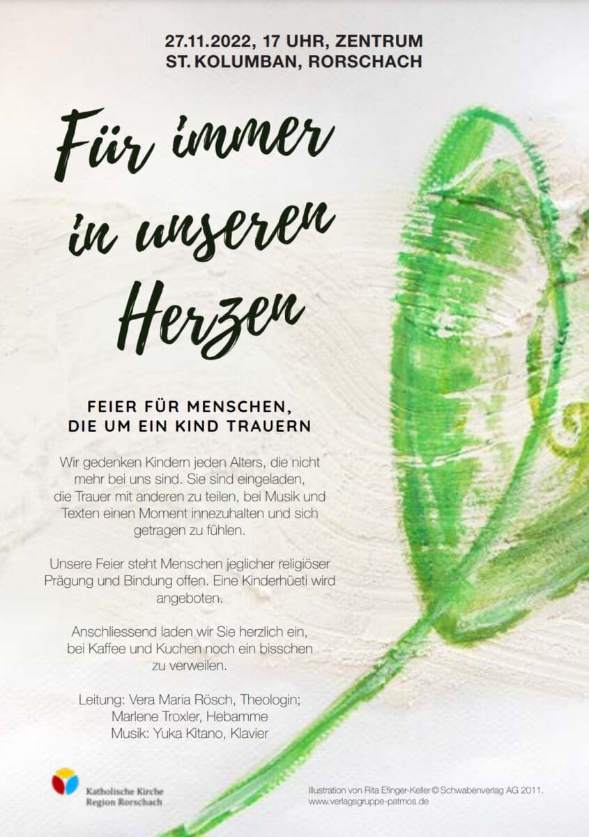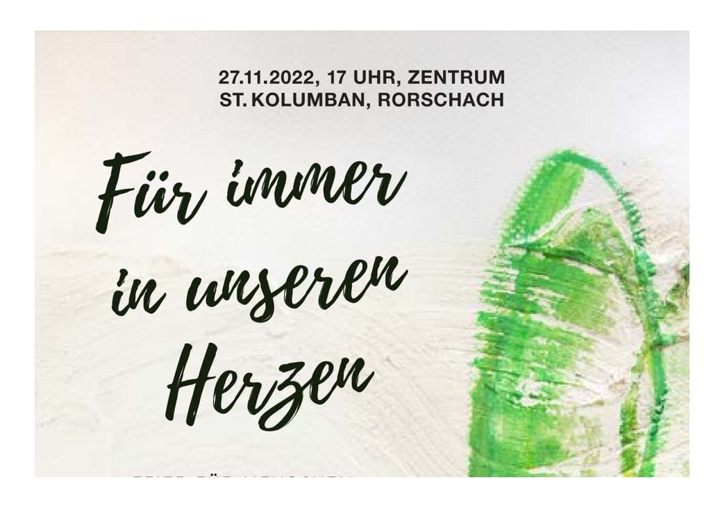 Gedenkfeier für Menschen, die um ein Kind trauernThemen:Kath. RorschachKulturPartnerRorschach 21. November 2022 - 05:20Nächsten Sonntag ab 17 Uhr im Zentrum St. Kolumban in Rorschach. Details finden Interessierte hier.Teilen mit: Einen Link per E-Mail an einen Freund senden (Wird in neuem Fenster geöffnet) E-Mail Drucken (Wird in neuem Fenster geöffnet) Drucken Auf Facebook teilen (Wird in neuem Fenster geöffnet) Facebook Auf X teilen (Wird in neuem Fenster geöffnet) X Auf WhatsApp teilen (Wird in neuem Fenster geöffnet) WhatsApp Gefällt mir:Gefällt mir Wird geladen …Newsletter abonnieren Bitte dieses Feld leer lassenBitte wähle, ob Du über jeden neuen Beitrag sofort oder lieber jeden Morgen gegen 9 Uhr eine Zusammenfassung der neusten Beiträge erhalten möchtest.Liste(n) auswählen: Neues vom Echo (Zusammenfassung) Neues vom Echo (Sofortbenachrichtigung) Dieses Feld wird benötigt.Prüfen Sie Ihren Posteingang und den Spamordner, um Ihr Abonnement zu bestätigen.
