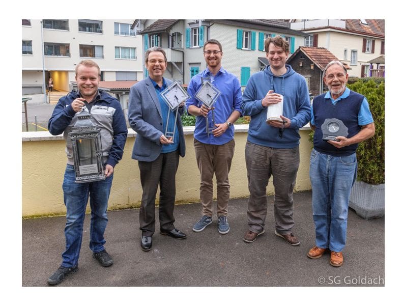 Die Jahresmeister der Schützengesellschaft Goldach sind Robin Müller Gewehr 300m, Peter Thür Gewehr 50m, Jérôme Högger Pistole, bei den Jungschützen Kurs 3 + 4 Rieder Ilja und Kurs 1 + 2 Meder Leoni. Das Beitragsbild oben zeigt von links Fabian Hörler, Peter Thür, Robin Müller; Jérôme Högger, Josef Frei.