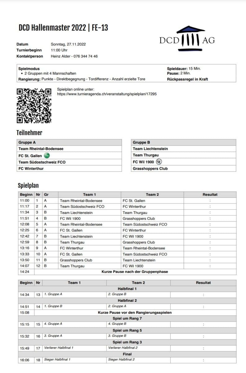 Am Sonntag (Turnierbeginn: 11.00 Uhr) messen sich in der Kategorie FE13 die Auswahlteams des Thurgaus, Rheintal-Bodensee, Liechtenstein und der Südostschweiz mit dem FC St. Gallen, Grasshoppers Club Zürich, FC Wil und FC Winterthur miteinander.