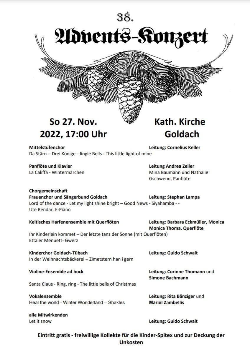 Heute Sonntag, 27. November, lädt die Musikschule Goldach erstmals auf vielfachen Wunsch bereits um 17.00 Uhr zum traditionellen Adventskonzert in die katholische Kirche Goldach ein. Es ist das erste Konzert des Projektchores bestehend aus dem Frauenchor und dem Sängerbunds Goldach. Die Leitung hat Stephan Lampa und Ute Rendar wird am E-Piano begleiten.