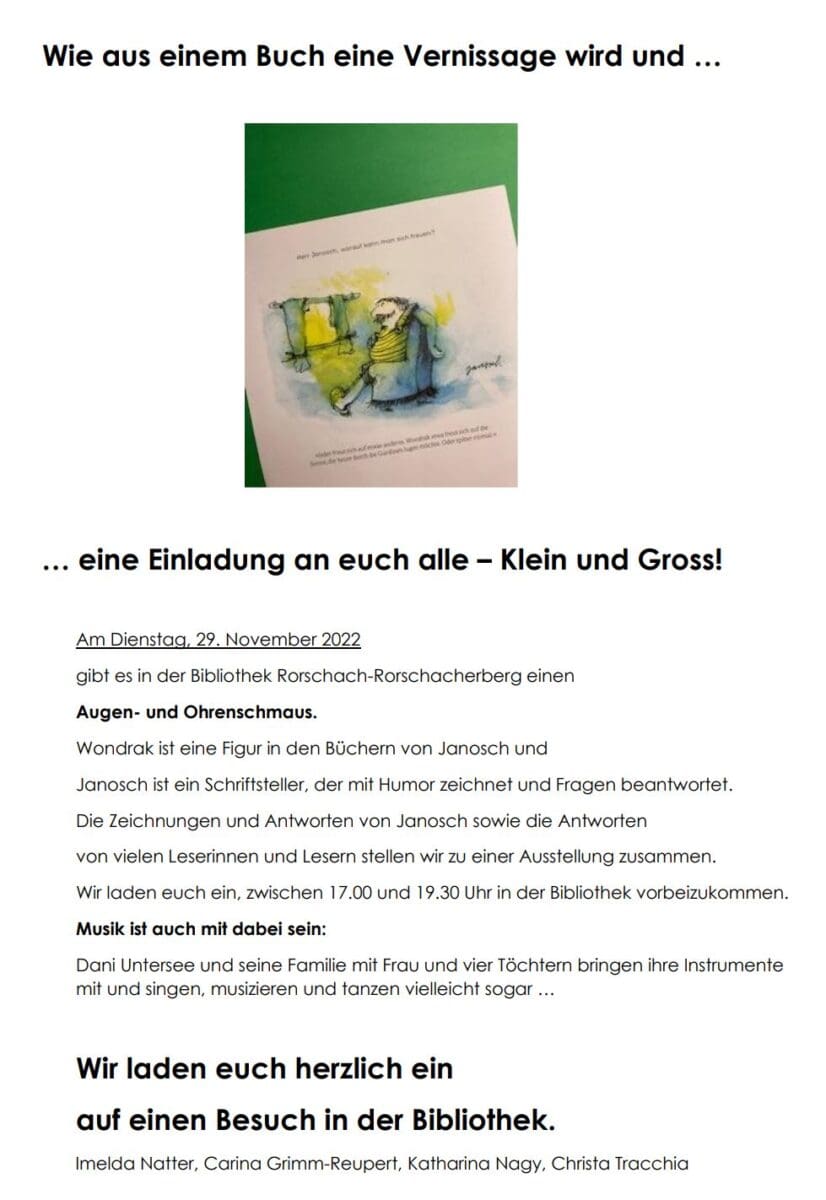 Das Rorschacher Echo hat bereits letzten Mittwoch darauf hingewiesen, dass morgen Dienstag in der Bibliothek in Rorschach eine nicht alltägliche Vernissage stattfindet. Man darf gespannt sein, was dabei herauskommt, wenn die Frau Natter was mit dem Herrn Janosch auf die Reihe bringen will…