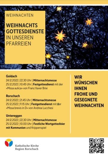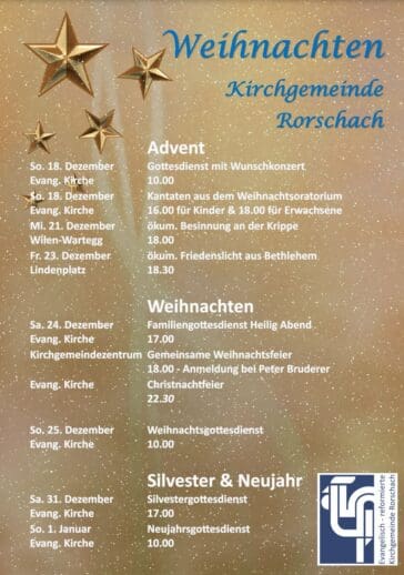 Das Angebot der Kirchen rund um Weihnachten 2022Themen:Kath. RorschachKulturPartnerRef. RorschachRegionRorschach 29. November 2022 - 05:09Die einzelnen Hinweise findet man auch auf den jeweiligen Homepages (KKRR, Ref. Rorschach). Teilen mit: Einen Link per E-Mail an einen Freund senden (Wird in neuem Fenster geöffnet) E-Mail Drucken (Wird in neuem Fenster geöffnet) Drucken Auf Facebook teilen (Wird in neuem Fenster geöffnet) Facebook Auf X teilen (Wird in neuem Fenster geöffnet) X Auf WhatsApp teilen (Wird in neuem Fenster geöffnet) WhatsApp Gefällt mir:Gefällt mir Wird geladen …Newsletter abonnieren Bitte dieses Feld leer lassenBitte wähle, ob Du über jeden neuen Beitrag sofort oder lieber jeden Morgen gegen 9 Uhr eine Zusammenfassung der neusten Beiträge erhalten möchtest.Liste(n) auswählen: Neues vom Echo (Zusammenfassung) Neues vom Echo (Sofortbenachrichtigung) Dieses Feld wird benötigt.Prüfen Sie Ihren Posteingang und den Spamordner, um Ihr Abonnement zu bestätigen.