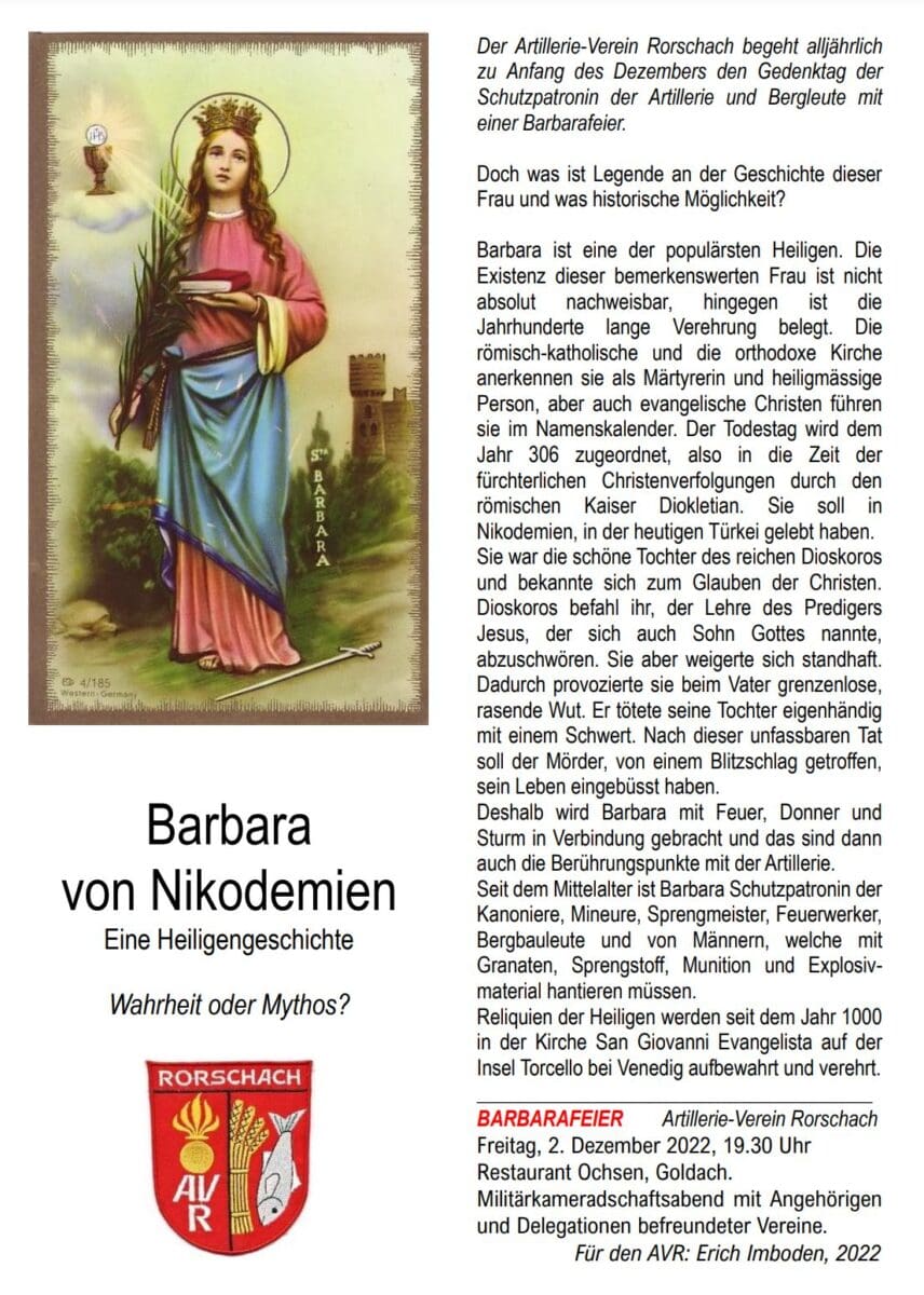 Barbarafeier des Artillerie-Vereins RorschachThemen:GoldachRorschach 30. November 2022 - 05:10Der Anlass findet kommenden Freitag, 2. Dezember 2022, ab 19.30 Uhr im Restaurant Ochsen in Goldach statt.Flyer: pd av rorschach / eiTeilen mit: Email a link to a friend (Wird in neuem Fenster geöffnet) E-Mail Drucken (Wird in neuem Fenster geöffnet) Drucken Share on Facebook (Wird in neuem Fenster geöffnet) Facebook Share on X (Wird in neuem Fenster geöffnet) X Share on WhatsApp (Wird in neuem Fenster geöffnet) WhatsApp Gefällt mir:Gefällt mir Wird geladen …Newsletter abonnieren Bitte dieses Feld leer lassenBitte wähle, ob Du über jeden neuen Beitrag sofort oder lieber jeden Morgen gegen 9 Uhr eine Zusammenfassung der neusten Beiträge erhalten möchtest.Liste(n) auswählen: Neues vom Echo (Zusammenfassung) Neues vom Echo (Sofortbenachrichtigung) Dieses Feld wird benötigt.Prüfen Sie Ihren Posteingang und den Spamordner, um Ihr Abonnement zu bestätigen.