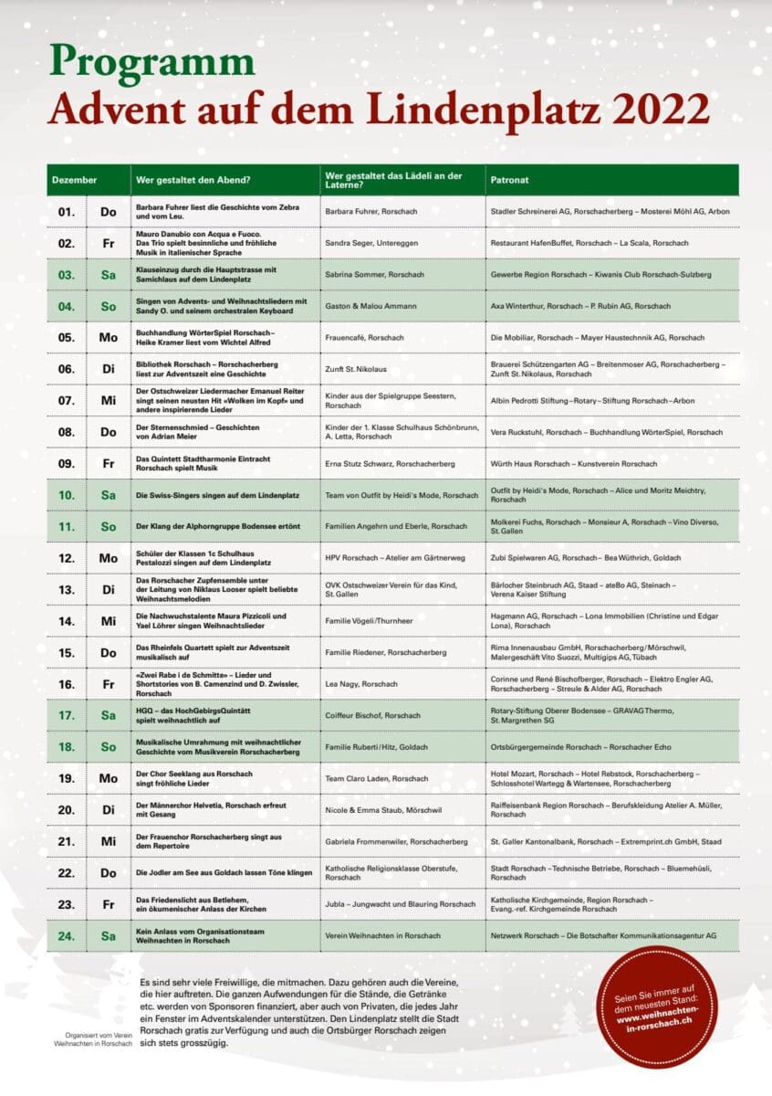 The same procedure as every year ist man fast geneigt zu sagen. Aber ab heute kann man sich auf dem Lindenplatz in Rorschach bis zum 23. Dezember (dann wird das Friedenslicht verteilt) täglich für rund eine halbe Stunde dem „Vorweihnachtsstress“ entziehen. Das Rorschacher Echo wird in loser Folge über diesen beliebten Adventsanlass berichten. Die täglich geöffneten Fenster findet man auch auf der Homepage des Vereins. Das Programm ist hier auch nochmals abgedruckt.