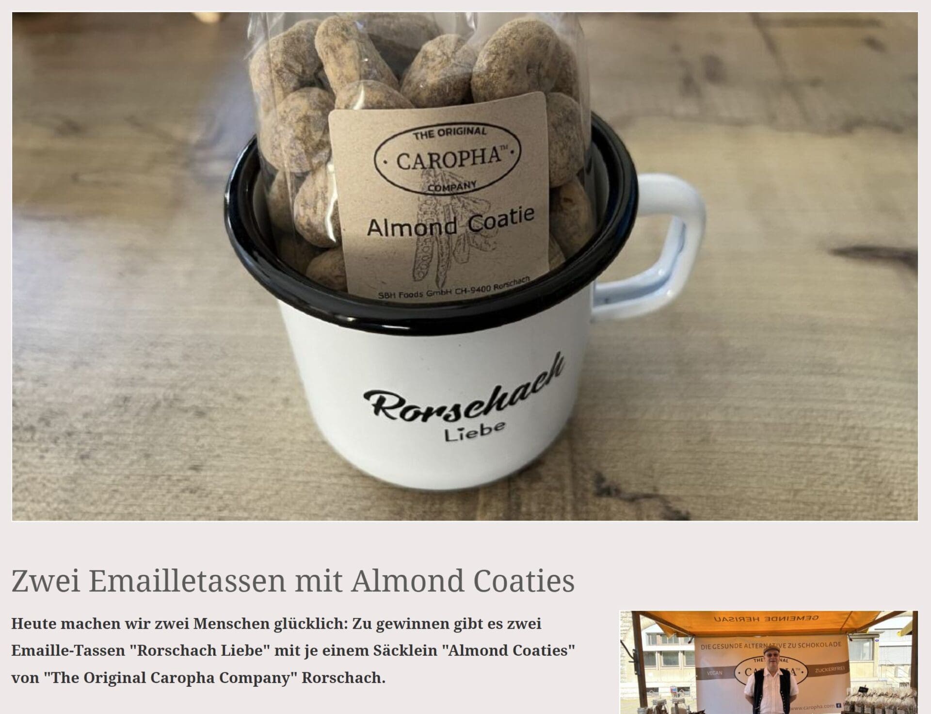 Zu gewinnen gibt es heute 2 Emailletassen mit einem speziellen Inhalt. Die Schoggi, welche ja gar keine Schoggi ist, ist in aller Munde. Das Produkt des Rorschachers Philipp Kern gibt es heute im Adventskalender der Ortsbürger Rorschach als Beilage zu gewinnen. Und da heute Bummelsunntig ist, findet man dieses Produkt auch in Rorschachs Gassen. Das Caropha-Team ist an der Neugasse zu finden (unmittelbar vis-à-vis Leder Koller und Verzauberte Momente).