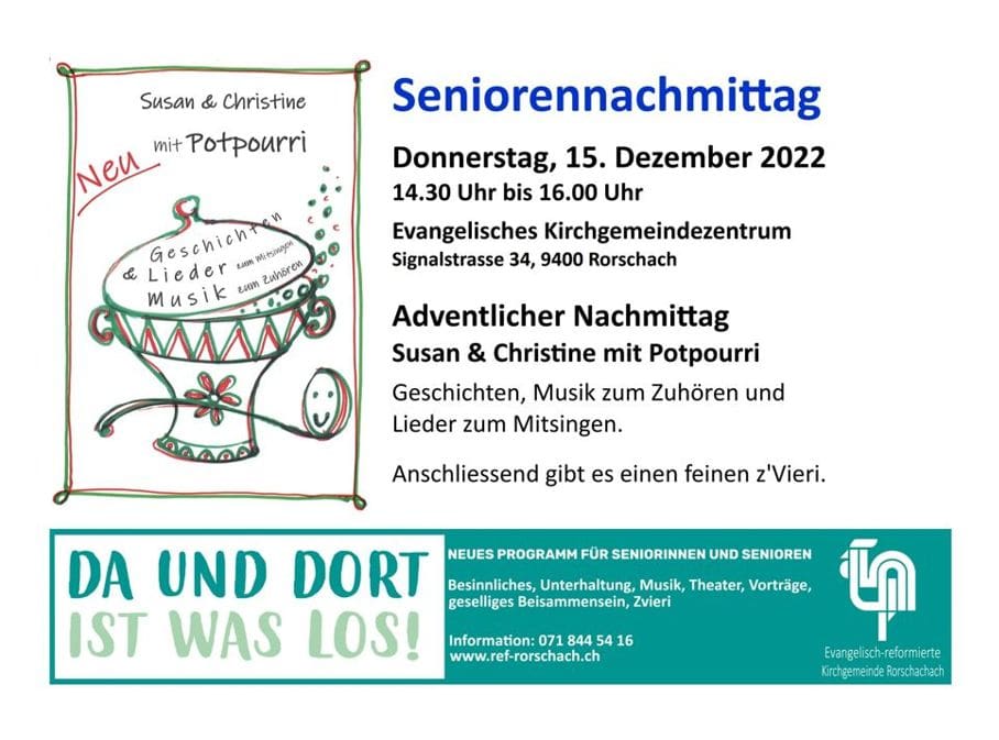 Adventlicher Nachmittag mit Susan & Christine am Donnerstag, 15. Dezember 2022 um 14.30 Uhr im Evangelischen Kirchgemeindezentrum Rorschach. Begleitet werden sie von zwei Musikern. Am Seniorennachmittag gibt es einen adventlichen Nachmittag mit Geschichten, Musik zum Zuhören und Lieder zum Mitsingen. Anschliessend gibt es einen feinen z’Vieri. Alle Interessierten sind dazu herzlich eingeladen.