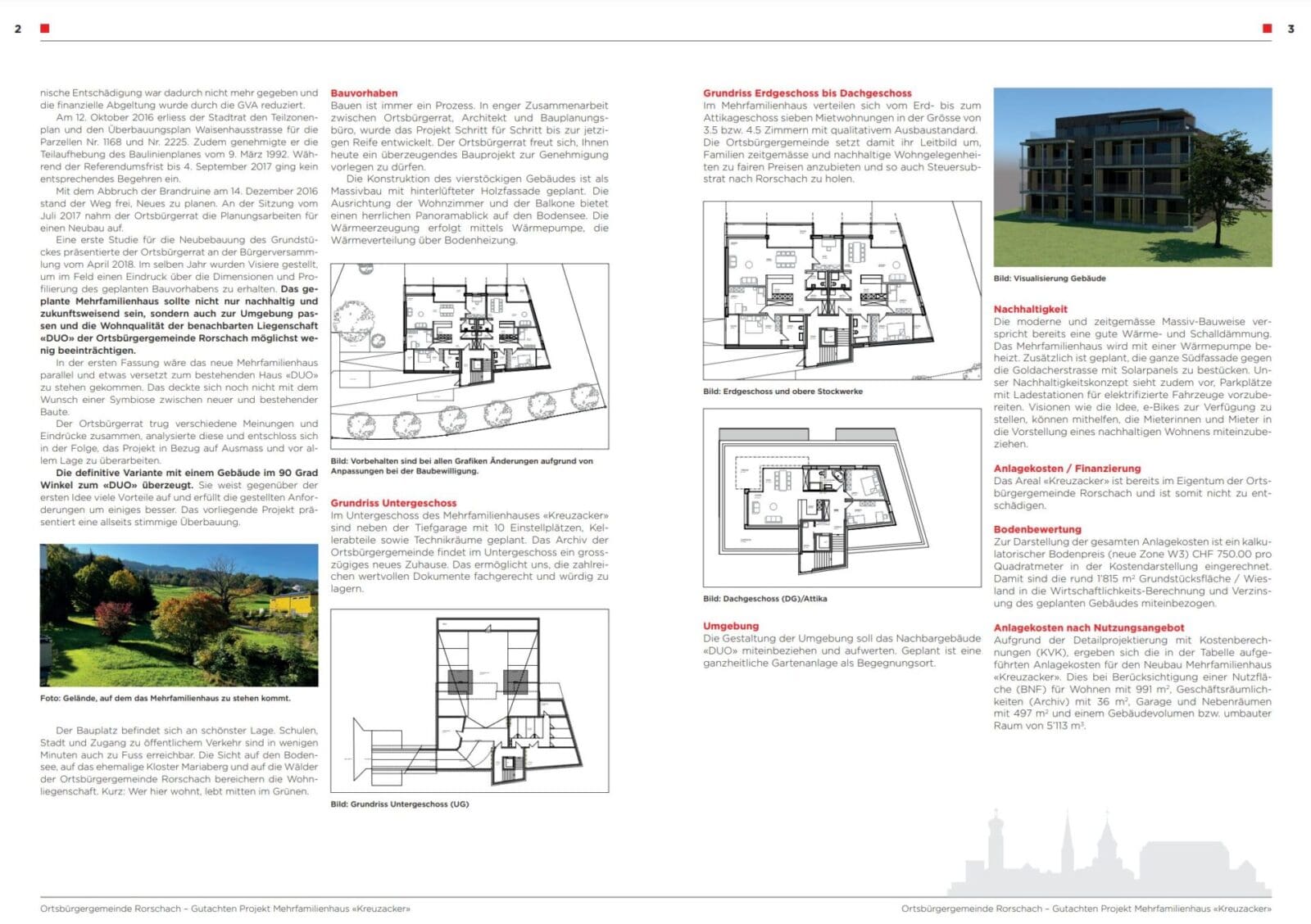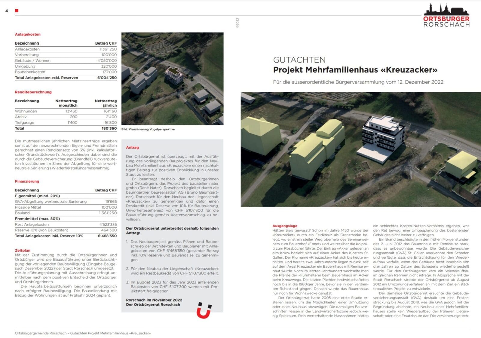 An der gestern Abend durchgeführten ausserordentlichen Bürgerversammlung der Ortsbürger Rorschach sind die Anwesenden im Rorschacher Feuerwehrdepot den Anträgen des Ortsbürgerrates gefolgt. Das Neubauprojekt „Kreuzacker“ kann mit Gesamtkosten von rund 6,5 Mio. Franken realisiert werden. Mit der Zustimmung wird die Bauausführung unter Berücksichtigung der vorliegenden Baubewilligung (die Eingabe für das Baugesuch wird noch diesen Monat erfolgen) umgesetzt. Die Hauptarbeiten beginnen unverzüglich nach erfolgter Baubewilligung. Die Bauvollendung mit Bezug der Wohnungen ist auf Frühjahr 2024 geplant. Das Gutachten finden Interessierte ganz unten dieses Berichtes. Ein Apéro rundete den gestrigen Abend ab. Hier einige Schnappschüsse von gestern Abend.