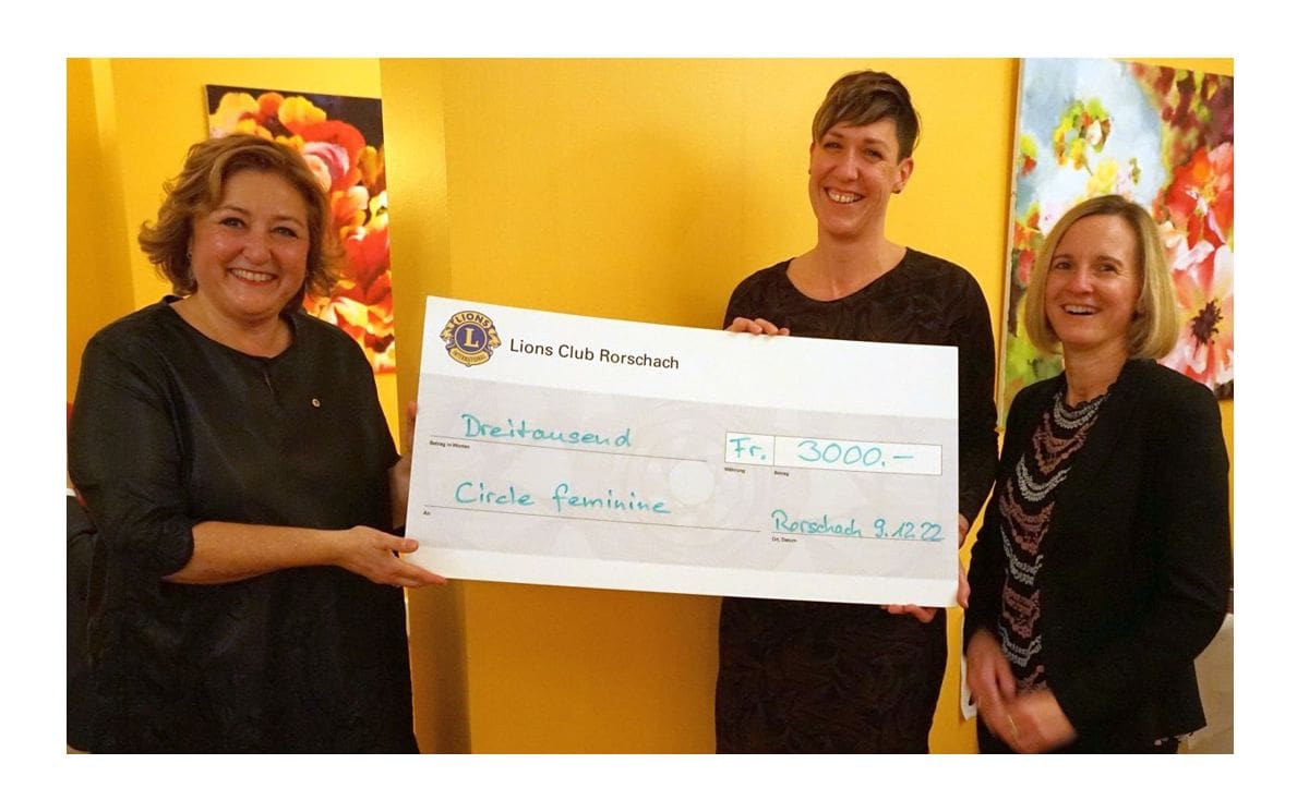Die Präsidentin des Lions Club Rorschach Ayse Schad überreichte an Nicole Sigrist und Rebecca Eilinger vom Circle féminin einen Check im Wert von 3000 Fr. Das Geld wurde von den Lions-Mitgliedern durch den Verkauf von selbstgebackenen Guetzli am Sternentag vom 20.11.2022 in Rheineck erwirtschaftet.