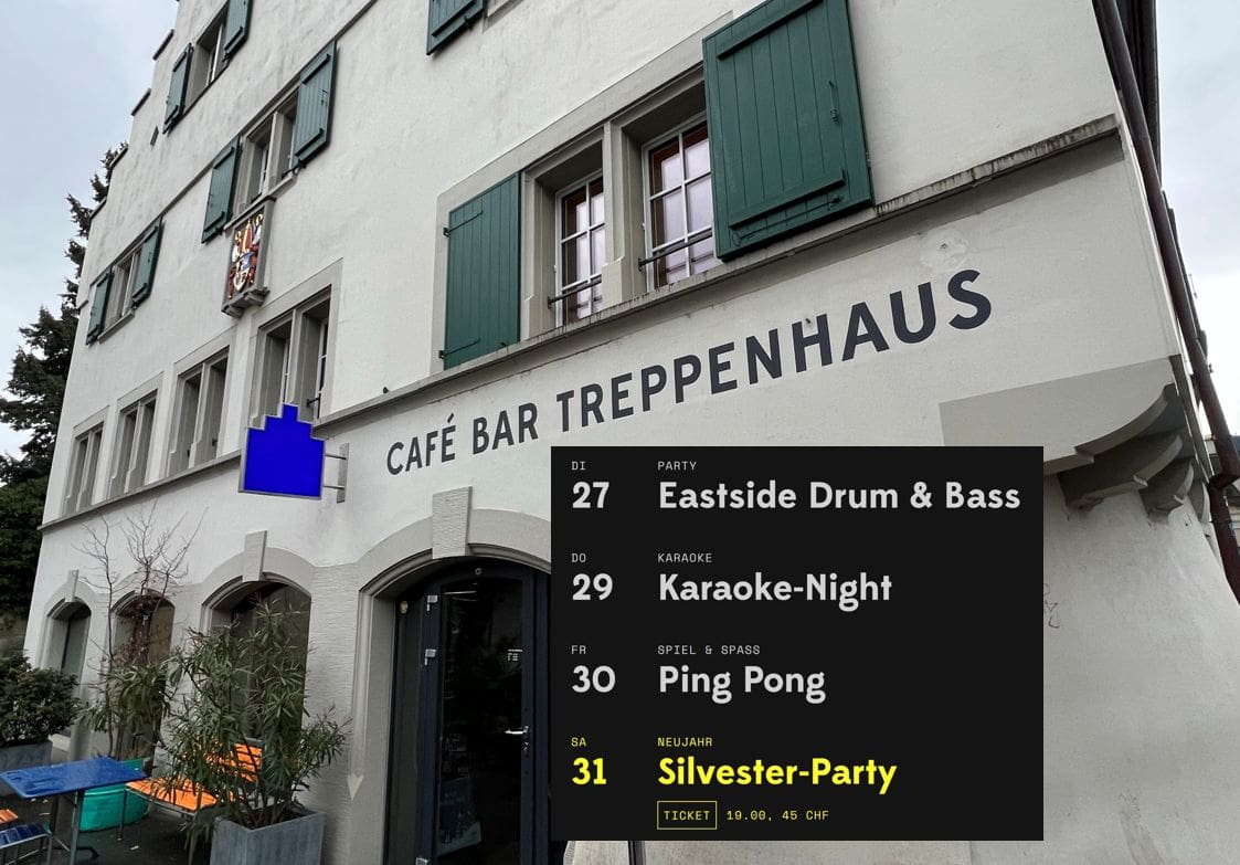 Treppenhaus mit Vollgas in die letzte Woche des JahresThemen:BeizenKulturRorschachTreppenhaus 26. Dezember 2022 - 05:18Da geht nochmals so richtig die Post ab. Mehr Infos zu den einzelnen Events gibt es hier und hier.Teilen mit: Einen Link per E-Mail an einen Freund senden (Wird in neuem Fenster geöffnet) E-Mail Drucken (Wird in neuem Fenster geöffnet) Drucken Auf Facebook teilen (Wird in neuem Fenster geöffnet) Facebook Auf X teilen (Wird in neuem Fenster geöffnet) X Auf WhatsApp teilen (Wird in neuem Fenster geöffnet) WhatsApp Gefällt mir:Gefällt mir Wird geladen …Newsletter abonnieren Bitte dieses Feld leer lassenBitte wähle, ob Du über jeden neuen Beitrag sofort oder lieber jeden Morgen gegen 9 Uhr eine Zusammenfassung der neusten Beiträge erhalten möchtest.Liste(n) auswählen: Neues vom Echo (Zusammenfassung) Neues vom Echo (Sofortbenachrichtigung) Dieses Feld wird benötigt.Prüfen Sie Ihren Posteingang und den Spamordner, um Ihr Abonnement zu bestätigen.