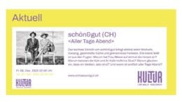 Am Freitag, 9. Dezember und Samstag, 10. Dezember 2022 um 20.00 Uhr gastieren wieder einmal schön&gut (CH) mit ihrem neuen Programm „Aller Tage Abend“ in der Aula Goldach. Der sechste…