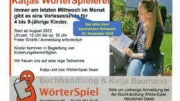 Kommenden Mittwoch, 30. November 2022, liest Katja Baumann eine tolle Geschichte im Obergeschoss der Buchhandlung WörterSpiel vor. Der Eintritt ist frei und es wird um eine Anmeldung gebeten. Wichtig: Kinder kommen in…