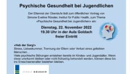 Heute Dienstag, 22. November 2022, ab 19.30 Uhr in der Aula Goldach. Freier Eintritt. Details findet man auf dem Flyer. (Text/Flyer/Bildschirmfoto: Silvia Reist-Germann, Elternrat der Oberstufe Goldach.