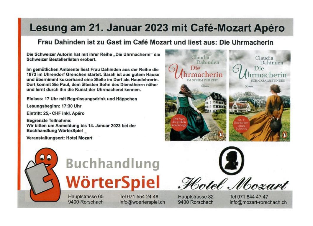 Der Anlass ist eine Coproduktion von der Buchhandlung WörterSpiel und dem Hotel Mozart und findet am Samstag, 21. Januar 2023 im Mozart statt. Bitte bis am 14.01.23 anmelden.