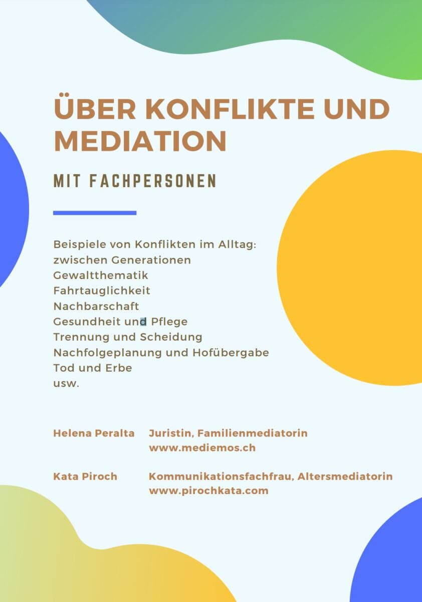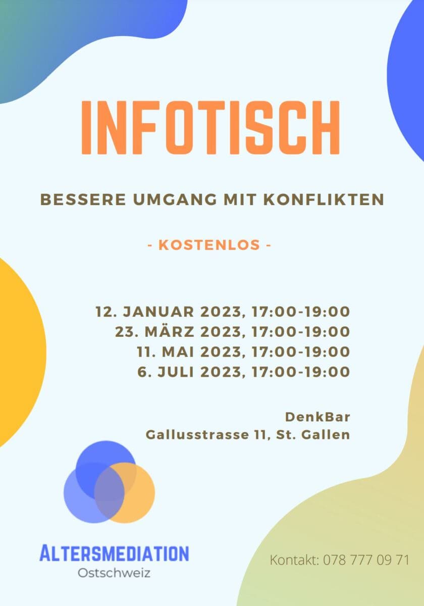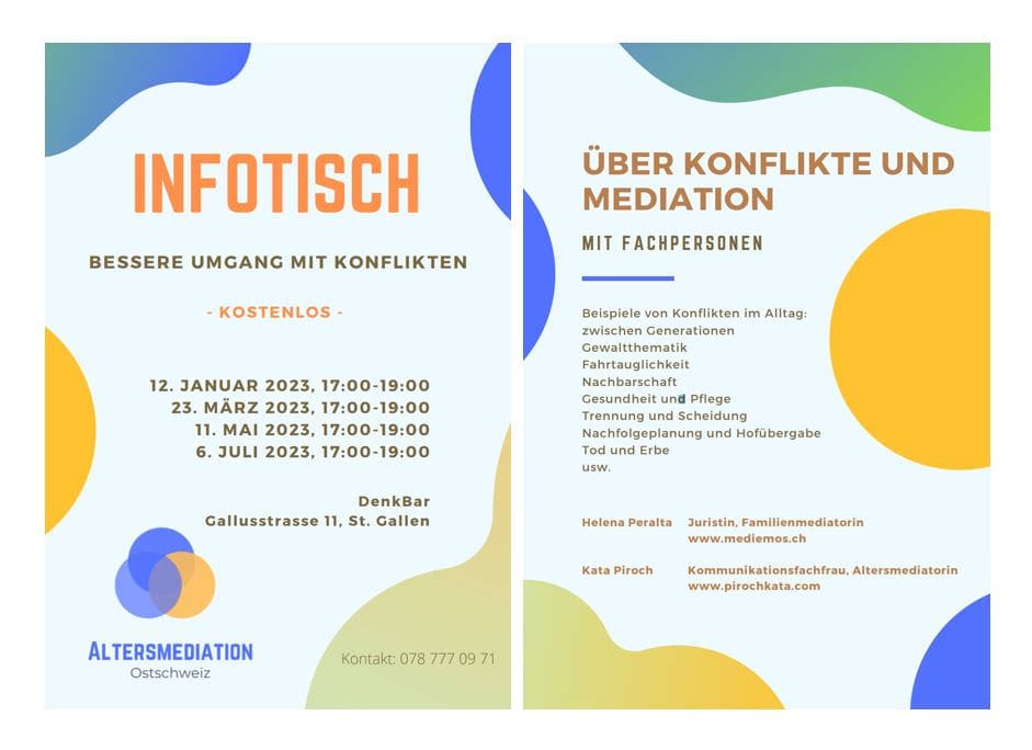 Konflikte gehören zum Leben und sind im Alltag präsent. Im Alter können neue Konflikte unterschiedlichster Art entstehen: in der Familie, mit der Nachbarschaft, mit dem Pflegepersonal, usw. Die Mediatorinnen Helena Peralta und die Rorschacherin Kata Piroch informieren unentgeltlich an einem Infotisch über die Möglichkeiten der Altersmediation. Das passiert kommenden Donnerstag, 12. Januar 2023, zwischen 17 und 19 Uhr in der DenkBar, Gallusstrasse 11, 9000 St.Gallen.