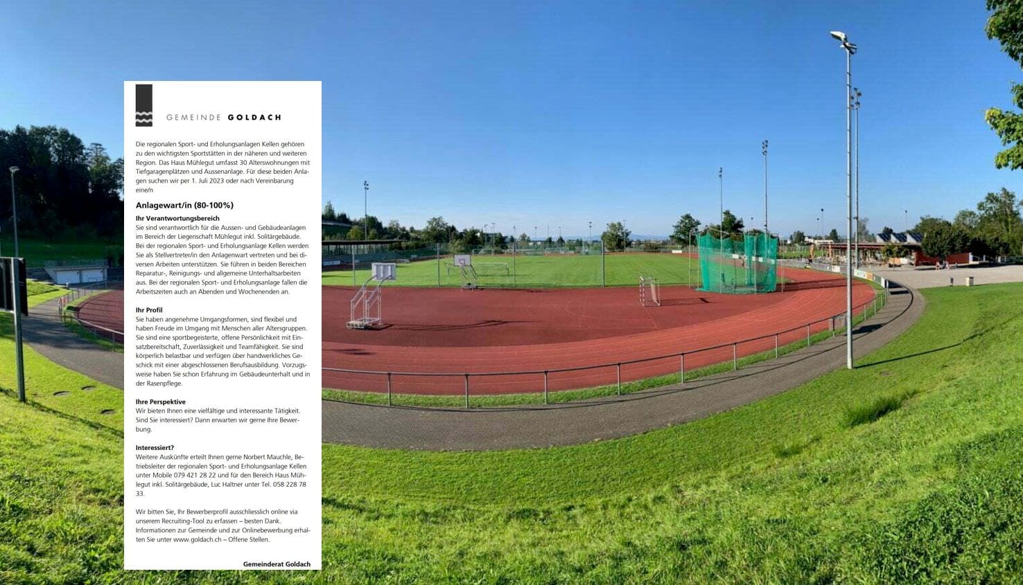 Die regionalen Sport- und Erholungsanlagen Kellen gehören zu den wichtigsten Sportstätten in der näheren und weiteren Region. Das Haus Mühlegut umfasst 30 Alterswohnungen mit Tiefgaragenplätzen und Aussenanlage. Für diese beiden Anlagen suchen wir per 1. Juli 2023 oder nach Vereinbarung eine/n Anlagewart/in (80-100%). Bewerben können sich Interessierte hier.