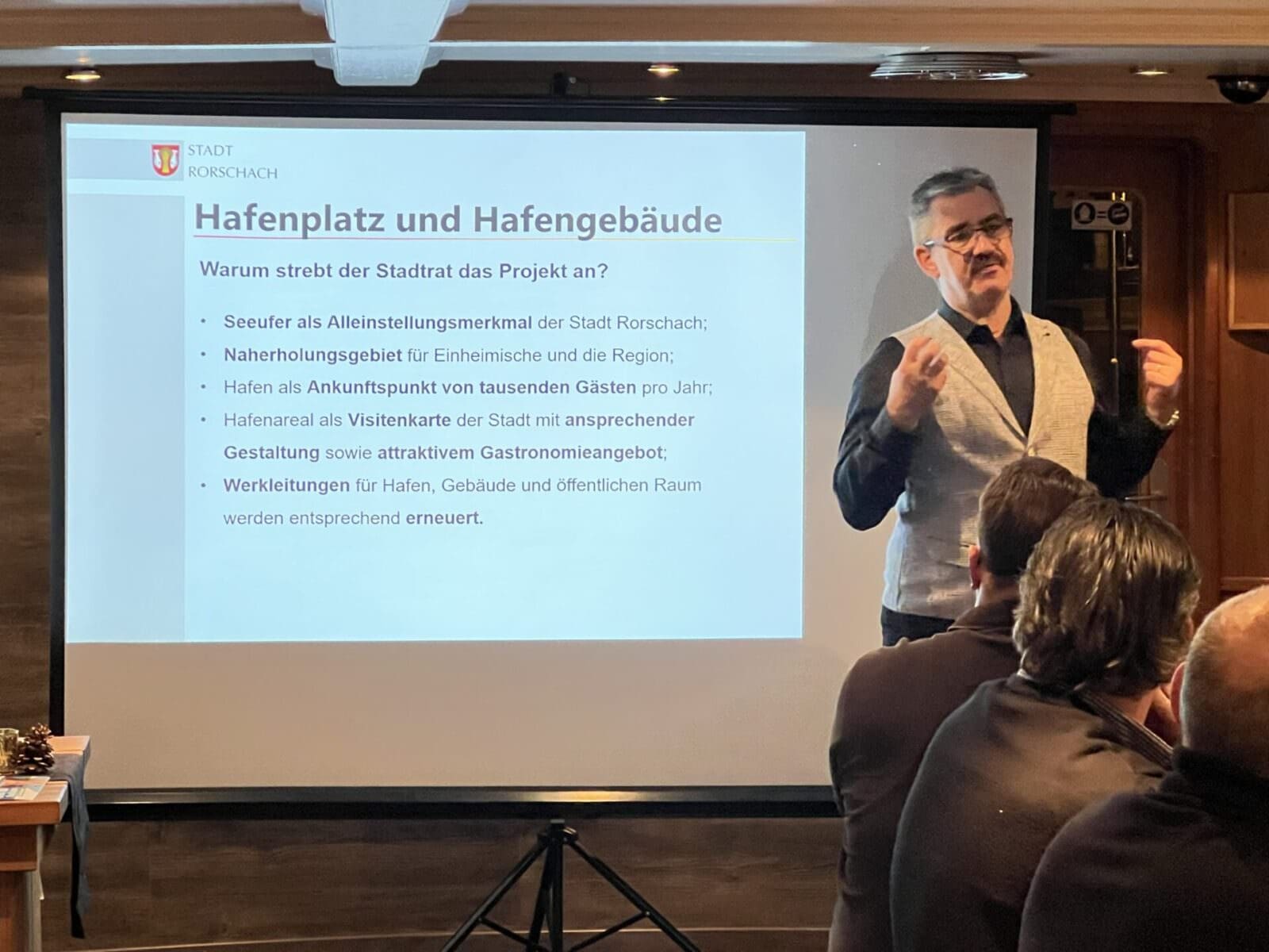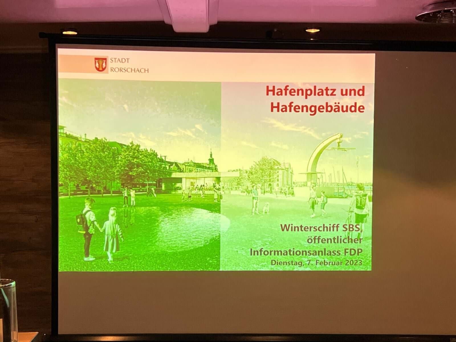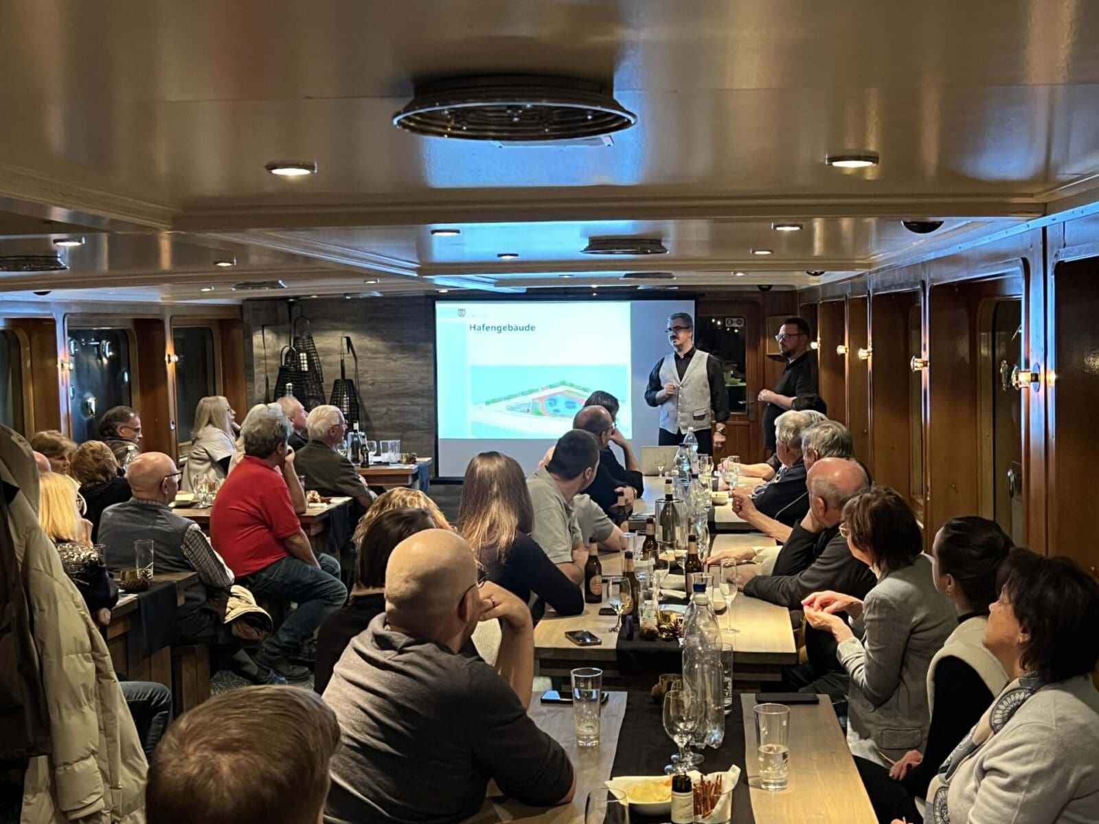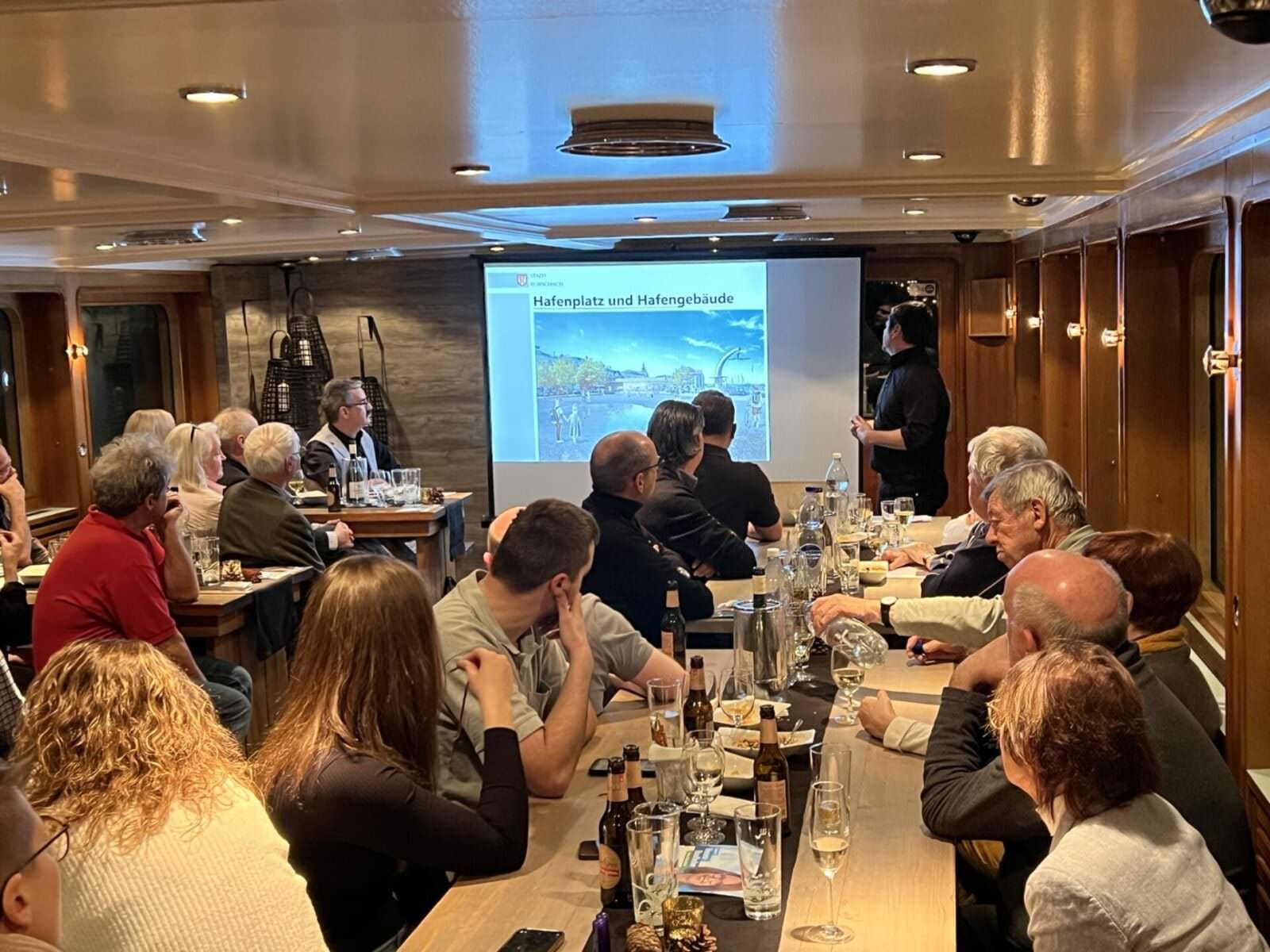 Gestern Abend hat die FDP der Stadt Rorschach die interessierte Bevölkerung eingeladen, sich direkt vor Ort über diese Abstimmungsvorlage zu informieren. Rund 50 Interessierte lauschten auf dem Schiff Thurgau den Ausführungen von Stadtpräsident Röbi Raths und Ronnie Ambauen, Leiter Bau und Stadtentwicklung Rorschach, die das Projekt erläuterten. Das Abstimmungsgutachten wird in den nächsten Tagen zugestellt, damit alle Rorschacher:innen über die relevanten Daten informiert sind. Zur Erinnerung: Es gab schon vor rund 10 Jahren eine Abstimmung. Die Vorlage fand damals keine Mehrheit und wurde mit 943 gegen 886 verworfen. Abgestimmt wurde damals über ein Hafengebäude ohne Platz. Hier Bilder von gestern Abend.