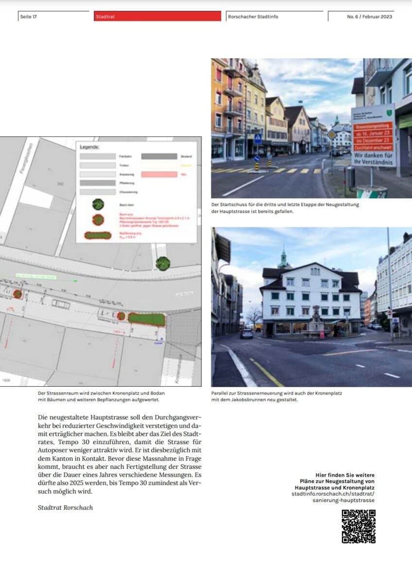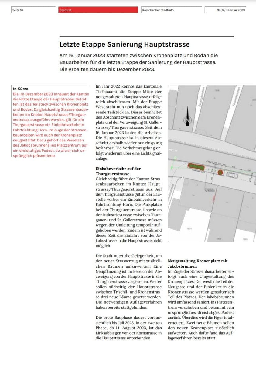 Bis im Dezember 2023 erneuert der Kanton die letzte Etappe der Hauptstrasse in Rorschach. Betroffen ist aktuell das Teilstück zwischen Kronenplatz und Bodan. Da gleichzeitig Strassenbauarbeiten im Knoten Hauptstrasse/Thurgauerstrasse ausgeführt werden, gilt für die Thurgauerstrasse ein Einbahnverkehr in Fahrtrichtung Horn. Im Zuge der Strassenbauarbeiten wird auch der Kronenplatz neugestaltet. Dazu gehört das Versetzen des Jakobsbrunnens ins Platzzentrum auf ein dreistufiges Podest, so wie er sich ursprünglich präsentierte. Mehr Infos findet man in den soeben verteilten Rorschacher Stadtinfos No. 6 auf den Seiten 16 und 17.