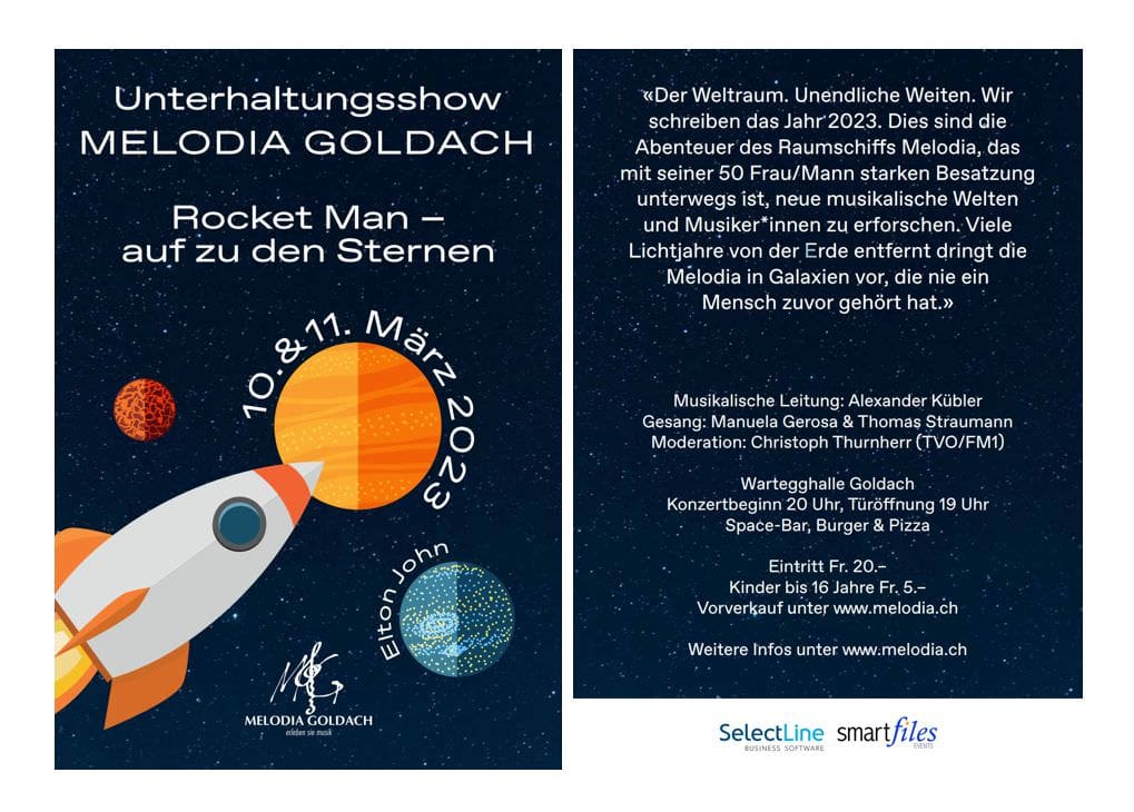 Die Unterhaltungsshows vom 10./11. März in der Wartegghalle Goldach ist am Horizont bereits in Sichtweite und einzelne Raketen sind bereits im Goldacher Strassenbild wahrnehmbar. Simone Kästli von der Melodia Goldach schreibt dazu: „Unsere Show „Rocket Man“ wird Sie in weniger als vier Wochen auf Erden begeistern. Die Ideen werden von den Sternen geholt und gekonnt vom OK-Team zusammengetragen. Die Melodien reichen vom intergalaktischen Star Trek bis zu den Ohrwürmern des überirdischen Elton Johns. Die Rakete wird gekonnt gesteuert durch unseren Dirigenten Alexander Kübler. Aus dem All berichten wird der FM1 Moderator Christoph Turnherr. Für die leeren Mägen und die durstigen Kehlen gibt es nicht nur Astronautennahrung. Nein, unsere Festwirte lassen nichts unversucht und verwöhnen Sie mit leckeren Gins (auch alkoholfrei) und schmackhaften Hamburgern und köstlichen Pizzas.