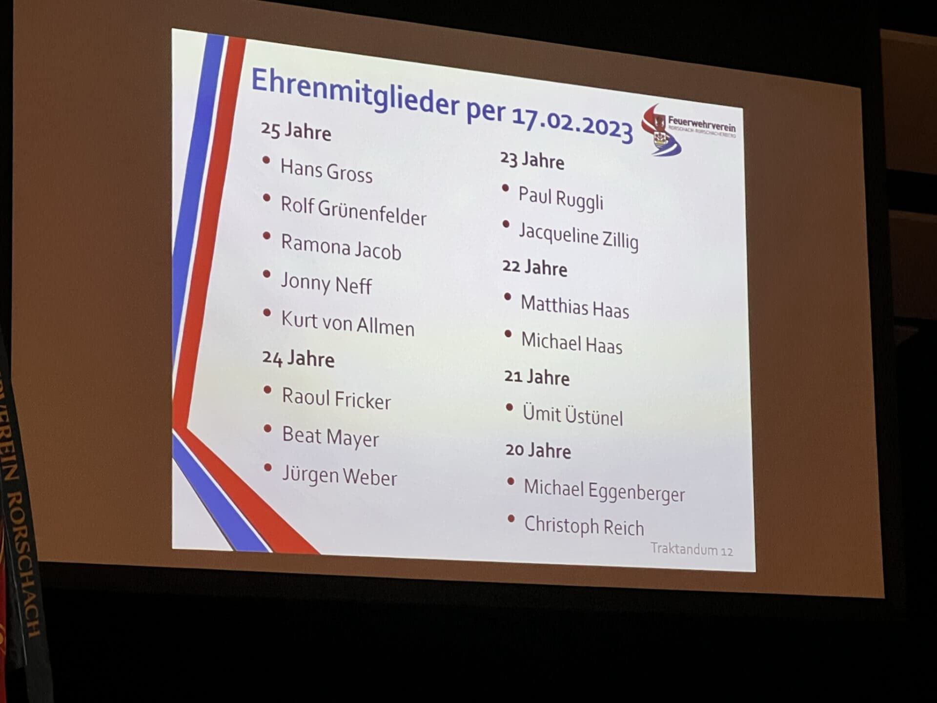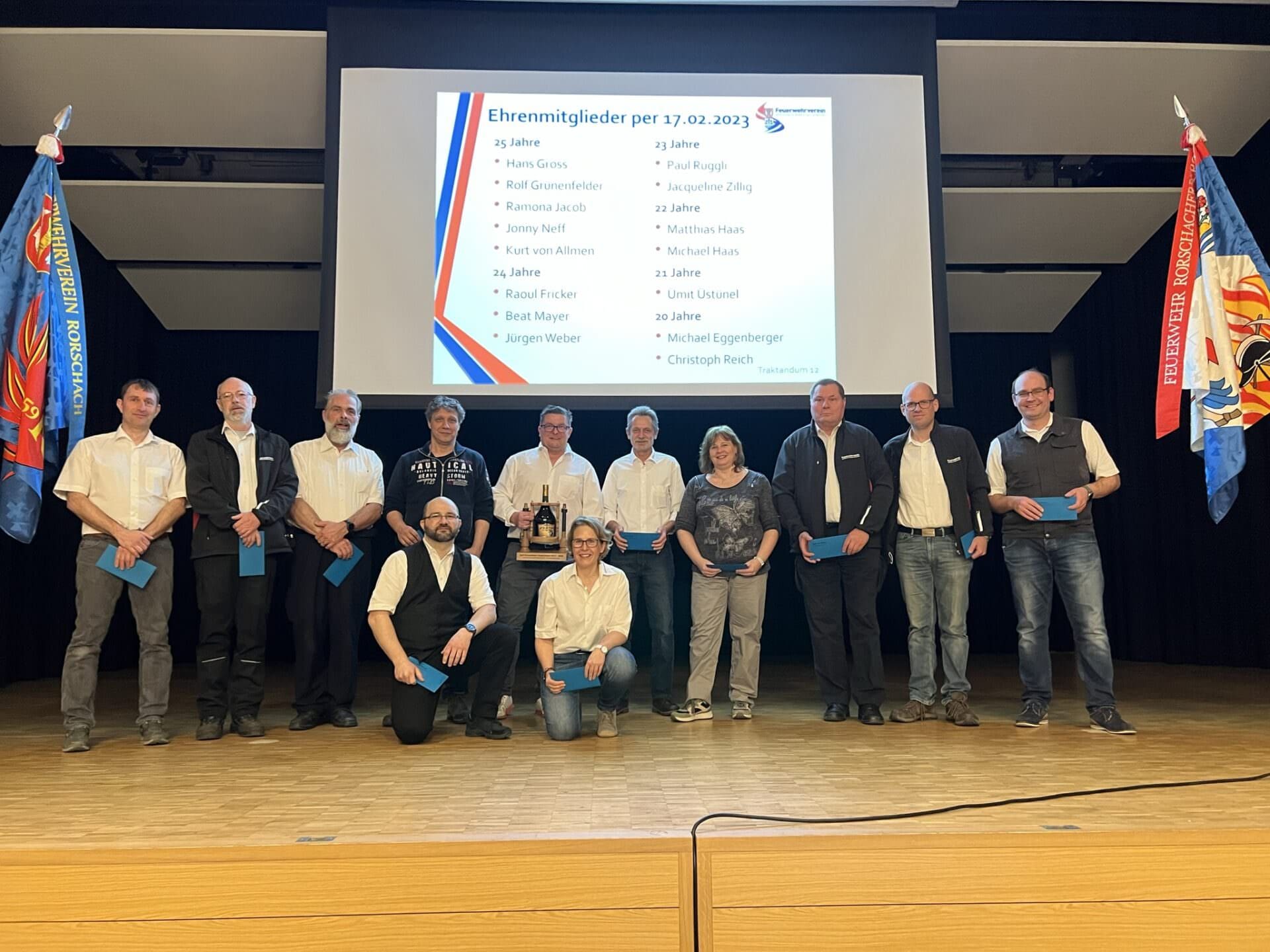Nebst der Totenehrung für die beiden Vereinsmitglieder Sepp Gaus (Vereinspräsident FwV Rorschach, Kdt Stv., Fw-Instruktor, er verstarb am 5. März im Alter von 91 Jahren. Erst kurz zuvor konnte ihm Stephan noch die Ehrung für 70 Jahre Vereinszugehörigkeit übergeben) und Werner Kümin (er verstarb am 27. April. Auch er wurde an der letzten Hauptversammlung für 50 Jahre Mitgliedschaft geehrt) hatte Vereinspräsident Michael Eggenberger eine Vielzahl von Ehrungen zu vollziehen. So wurde eine stattliche Zahl zu neuen Ehrenmitgliedern ernannt.