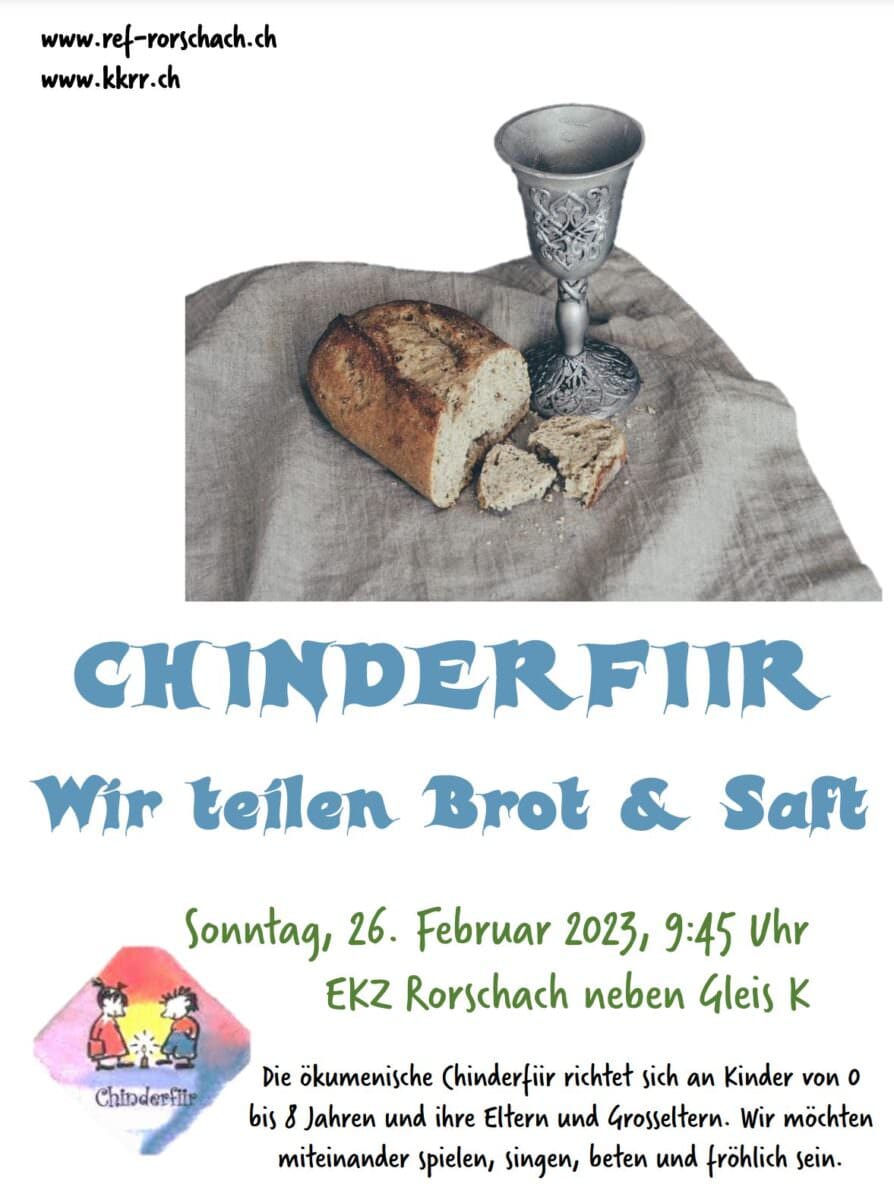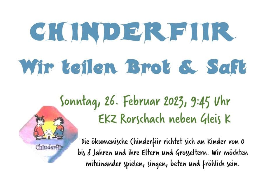 An der Chinderfiir werden Brot und Saft geteiltThemen:Kath. RorschachKulturPartnerRef. RorschachRorschach 20. Februar 2023 - 05:20Die ökumenische Chinderfiir richtet sich an Kinder von 0 bis 8 Jahren und ihre Eltern und Grosseltern. Diese Feier findet kommenden Sonntag statt. Mehr Informationen finden Interessierte hier und hier.Teilen mit: Einen Link per E-Mail an einen Freund senden (Wird in neuem Fenster geöffnet) E-Mail Drucken (Wird in neuem Fenster geöffnet) Drucken Auf Facebook teilen (Wird in neuem Fenster geöffnet) Facebook Auf X teilen (Wird in neuem Fenster geöffnet) X Auf WhatsApp teilen (Wird in neuem Fenster geöffnet) WhatsApp Gefällt mir:Gefällt mir Wird geladen …Newsletter abonnieren Bitte dieses Feld leer lassenBitte wähle, ob Du über jeden neuen Beitrag sofort oder lieber jeden Morgen gegen 9 Uhr eine Zusammenfassung der neusten Beiträge erhalten möchtest.Liste(n) auswählen: Neues vom Echo (Zusammenfassung) Neues vom Echo (Sofortbenachrichtigung) Dieses Feld wird benötigt.Prüfen Sie Ihren Posteingang und den Spamordner, um Ihr Abonnement zu bestätigen.