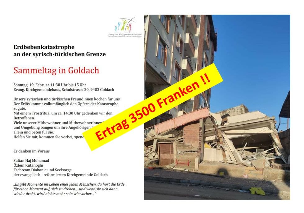 In der evangelischen Kirche in Goldach fand am letzten Sonntagnachmittag ein Spendenanlass für die Erdbebenopfer statt. Das interkulturelle Fest zählte ungefähr einhundert Besucher. Frauen, deren Heimat vom Erdbeben zerstört wurde, kochten traditionelle Gerichte und die Gäste konnten von vielen verschiedenen Speisen probieren. Anschliessend fand eine Feier mit Kerzen und Klaviermusik statt. Es konnten mehr als 3500 CHF gesammelt werden.