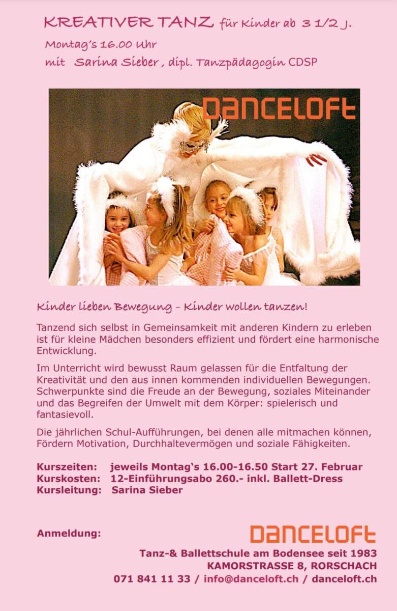 Kinder lieben Tanz – Kinder wollen sich bewegen…Themen:Rorschach 23. Februar 2023 - 05:15Kommenden Montag 27. Februar beginnt ein neuer Einführungskurs “KREATIVER TANZ “ für Mädchen ab 3 1/2 Jahren mit Sarina Sieber in der DANCELOFT Rorschach. Mehr Informationen dazu findet man auf der Homepage oder unten auf dem Flyer. (Text/Flyer: pd)Teilen mit: Einen Link per E-Mail an einen Freund senden (Wird in neuem Fenster geöffnet) E-Mail Drucken (Wird in neuem Fenster geöffnet) Drucken Auf Facebook teilen (Wird in neuem Fenster geöffnet) Facebook Auf X teilen (Wird in neuem Fenster geöffnet) X Auf WhatsApp teilen (Wird in neuem Fenster geöffnet) WhatsApp Gefällt mir:Gefällt mir Wird geladen …Newsletter abonnieren Bitte dieses Feld leer lassenBitte wähle, ob Du über jeden neuen Beitrag sofort oder lieber jeden Morgen gegen 9 Uhr eine Zusammenfassung der neusten Beiträge erhalten möchtest.Liste(n) auswählen: Neues vom Echo (Zusammenfassung) Neues vom Echo (Sofortbenachrichtigung) Dieses Feld wird benötigt.Prüfen Sie Ihren Posteingang und den Spamordner, um Ihr Abonnement zu bestätigen.