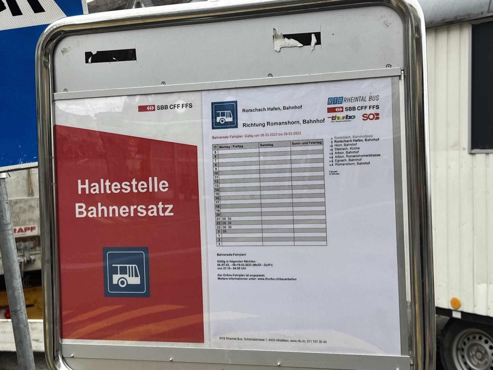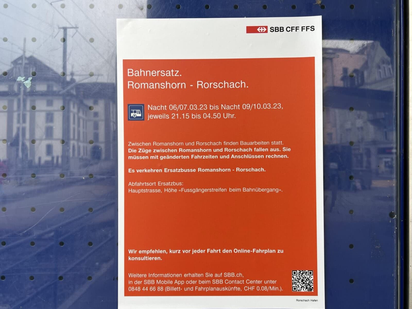 Die Strecke ist wegen Bauarbeiten für den Zugverkehr gesperrt. Zwischen Rorschach und Romanshorn verkehren Bahnersatzbusse. Man muss die geänderten Abfahrts- und Ankunftszeiten beachten, da sich die Fahrzeit um bis zu ca. 20 Minuten verlängern kann. Infos gibt es auch im Online-Fahrplan.