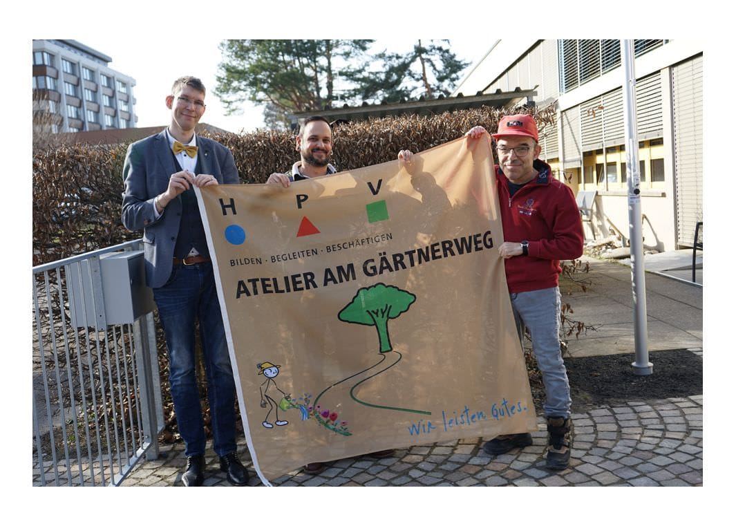 Im Eingangsbereich des Ateliers am Gärtnerweg, der Tagesstrukturstätte des HPV Rorschach, wehen seit kurzem die Goldacher und die selbst entworfene Fahne, die AAG-Fahne. Die Fahnen sind das Ergebnis der Idee von Timo Bättig und Martin Mäder, eine eigene Fahne für die Tagesstrukturstätte zu kreieren. Stolz hissen sie täglich zusammen die Fahnen, wenn es das Wetter zulässt. Das Beitragsbild oben zeigt von links Timo Bättig, Riaz Kazi und Martin Mäder, die stolz die neue AAG-Fahne präsentieren.