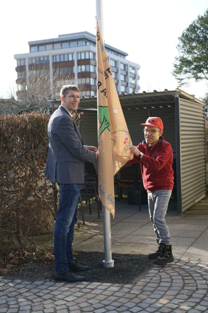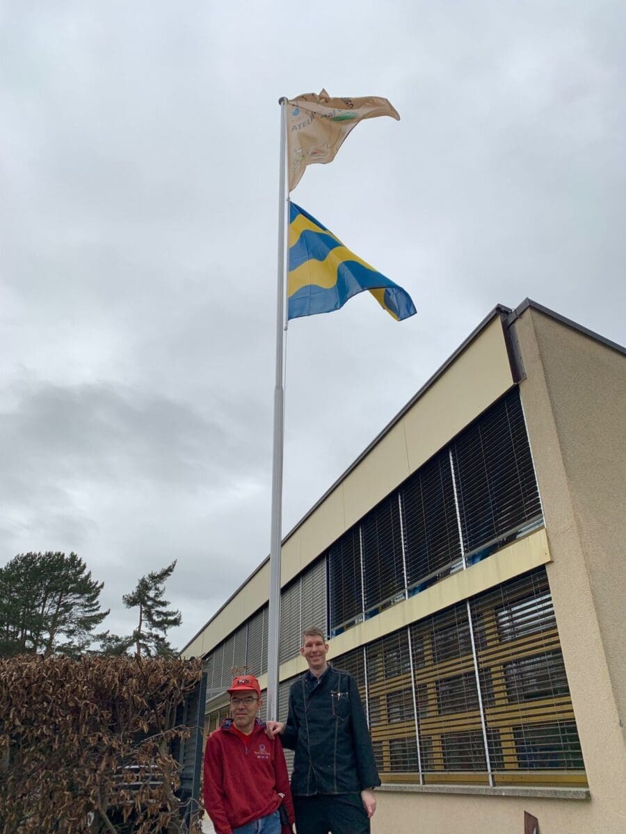 Nun sind die AAG-Fahne zusammen mit der Goldacher Fahne im Eingangsbereich der Tagesstrukturstätte praktisch täglich gehisst. Die Fahnen sind nicht nur das Ergebnis eines kreativen Prozesses, sondern zeigen zudem auf, was alles möglich ist, wenn der Wille zur Umsetzung vorhanden ist. «War ein cooles Projekt. Timo und Martin haben eindrücklich gezeigt, dass es Sinn macht dran zu bleiben», so Riaz Kazi, Leiter des Ateliers am Gärtnerweg. Die beiden verfolgen bereits ein neues Fahnenprojekt: Festtagsfahnen für besondere Momente und Anlässe. Denn ein Fest ohne Festtagsfahne ist kein richtiges Fest. (Text/Bilder: pd hpv us)