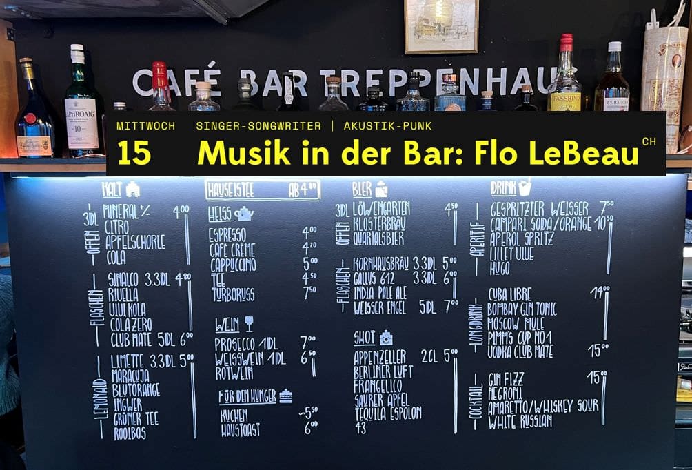 Flo LeBeau wagt mit seinem Solo-Projekt den Schritt alleine ins Rampenlicht. Er sieht seine Herausforderungdarin, als einzelner Musiker – bewaffnet mit Stimme und 6 Saiten – die Energie einer Band auf die Bühne zubringen. Im Sommer 2022 hatte er erste Auftritte als Strassenmusiker u.a. in Konstanz, Solothurn und Baselsowie Open-Mic-Slots u.a. in Berlin, Bern und Stans. Die intimen Akustik-Songs finden ihren Ursprungirgendwo in den Gefilden von Indie-, Alternative-Rock und Punk.“