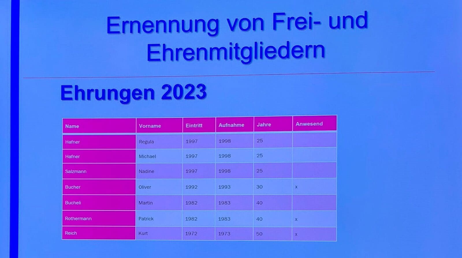 3 anwesende Mitglieder wurden für ihre langjährige Mitgliedschaft geehrt: Kurt Reich, 50 Jahre, Patrick Rothermann, 40 Jahre und Oliver Bucher mit 30 Jahren.