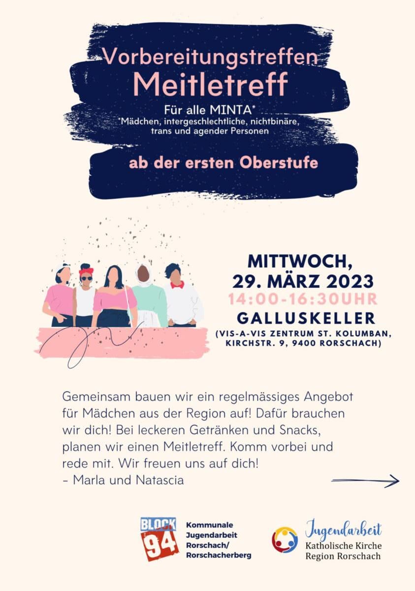 Marla und Natascia schreiben dazu: „Die Region Rorschach erhält einen neuen «Meitletreff». Monatlich können sich Mädchen* ab der sechsten Klasse treffen um gemeinsam zu plaudern, diskutieren, gestalten, lachen, Ideen entwickeln und diese umsetzen. Für die genauere Planung brauchen wir die Ideen der Mädchen. Deshalb laden wir am Mittwoch, 29. März 2023 von 14:00 – 16:30 Uhr alle interessierten Mädchen ab der sechsten Klasse in den Galluskeller (vis-a-vis Zentrum St. Kolumban, Kirchstrasse 9, 9400 Rorschach) zum Vorbereitungstreffen ein. Bei leckeren Snacks und Getränken planen wir gemeinsam den Meitletreff. Die ersten drei Daten des Treffs können bereits vorgemerkt werden: 26. April, 31. Mai und 28. Juni.“ Details findet man auf dem Flyer unten. (Text/Flyer: pd kkrr)