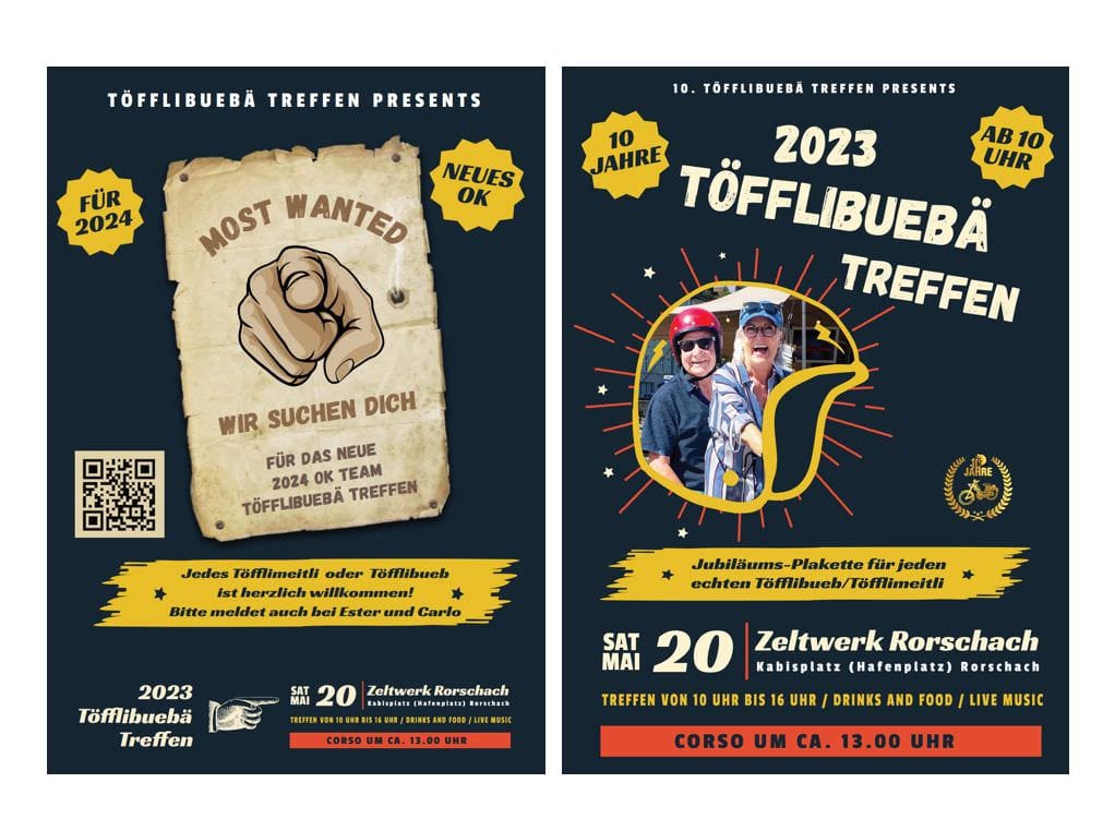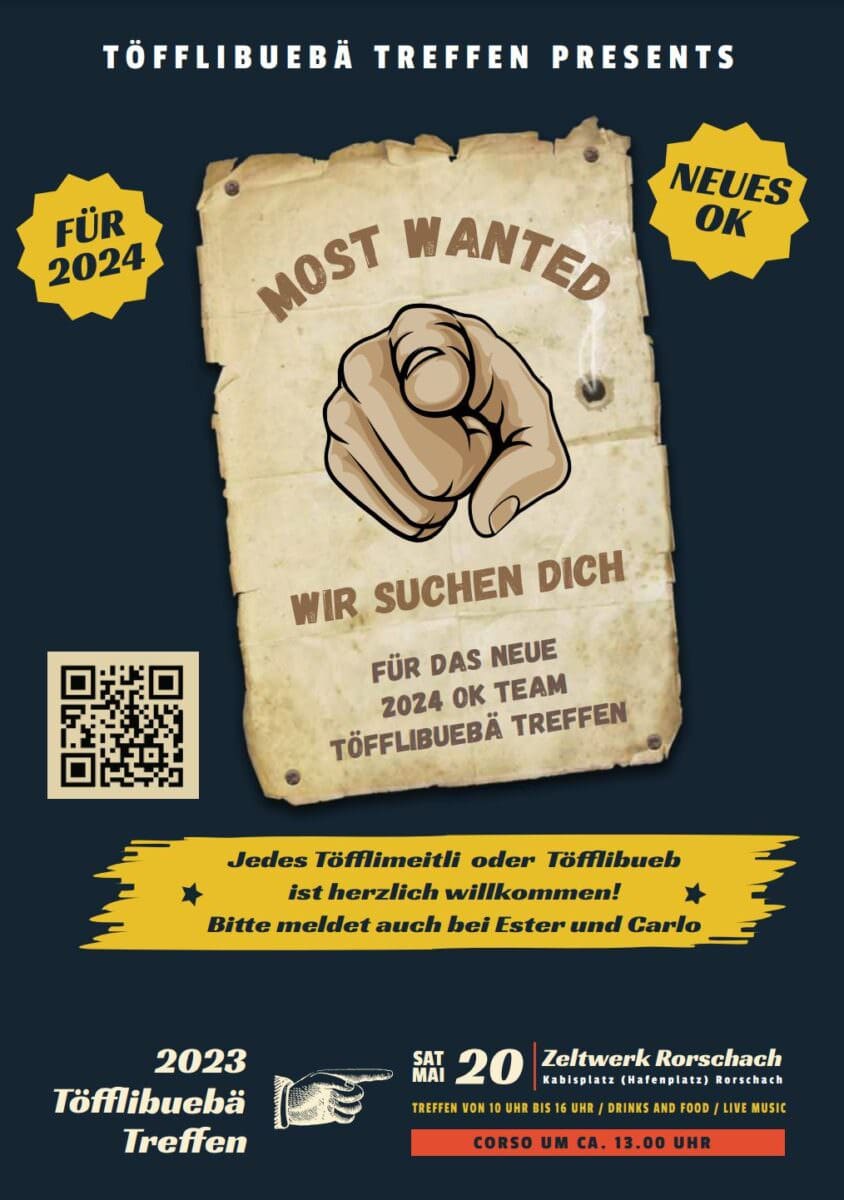 Nun suchen sie Leute, die diese Idee mit dem Töfflibuebä-Treffen weiterführen. Auf dem WANTED Flyer ist ein QR-Code, damit kommt man direkt aufs Mail von Alexander. Bei ihm und Yvette laufen die Fäden zusammen und alle Inputs werden dann gesammelt an Ester und Carlo weitergegeben.