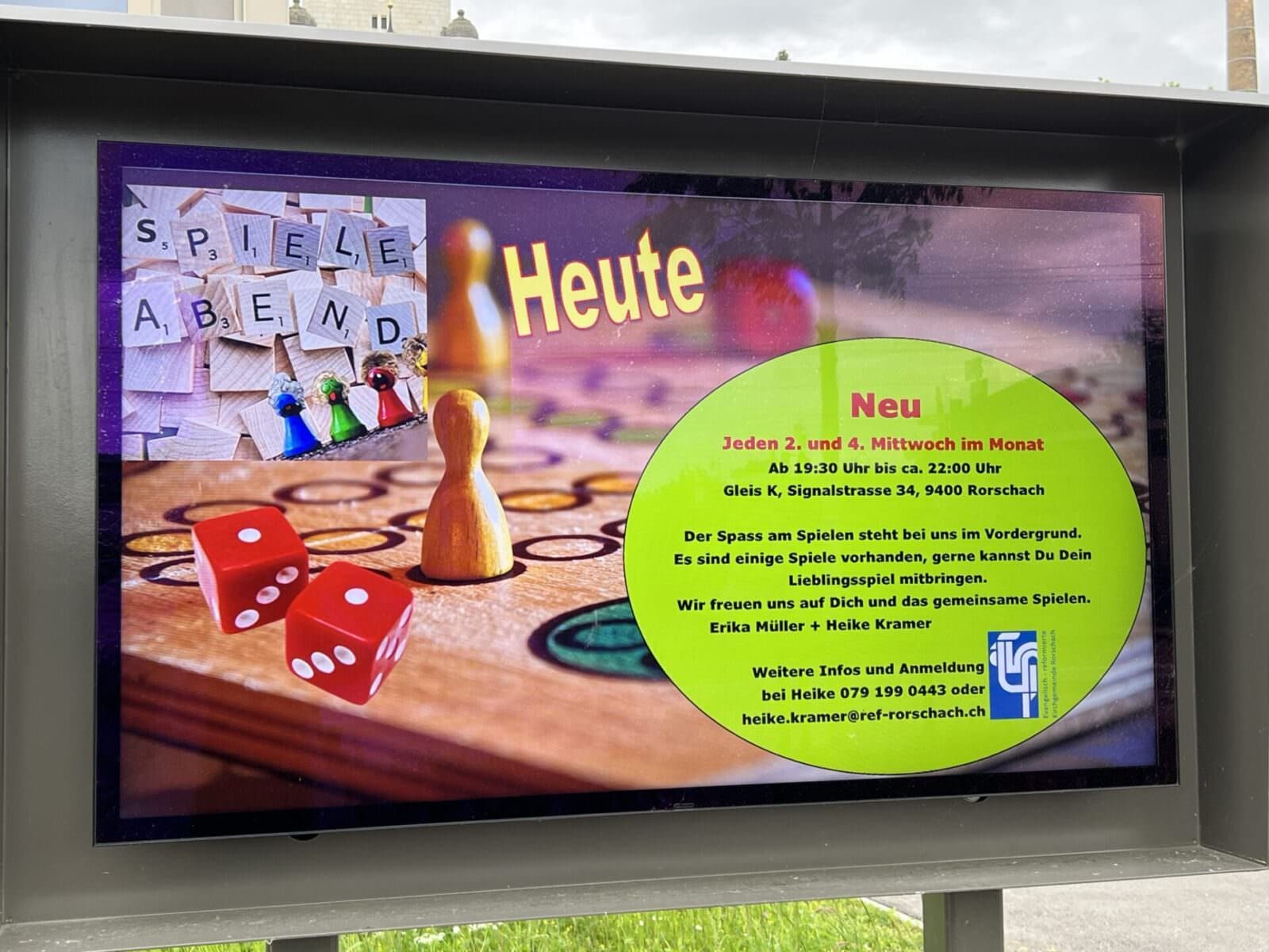 Jeden 2. und 4. Mittwoch im Monat jeweils von 19.30 bis 22 Uhr im Haus Gleis K, Signalstrasse 34, in Rorschach. Erika Müller und Heike Kramer schreiben dazu: „Der Spass am Spielen steht bei uns im Vordergrund. Es sind einige Spiele vorhanden, gerne kannst Du Dein Lieblingsspiel mitbringen. Wir freuen uns auf Dich und das gemeinsame Spielen.“