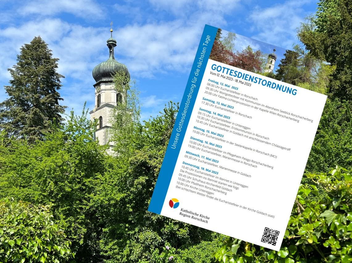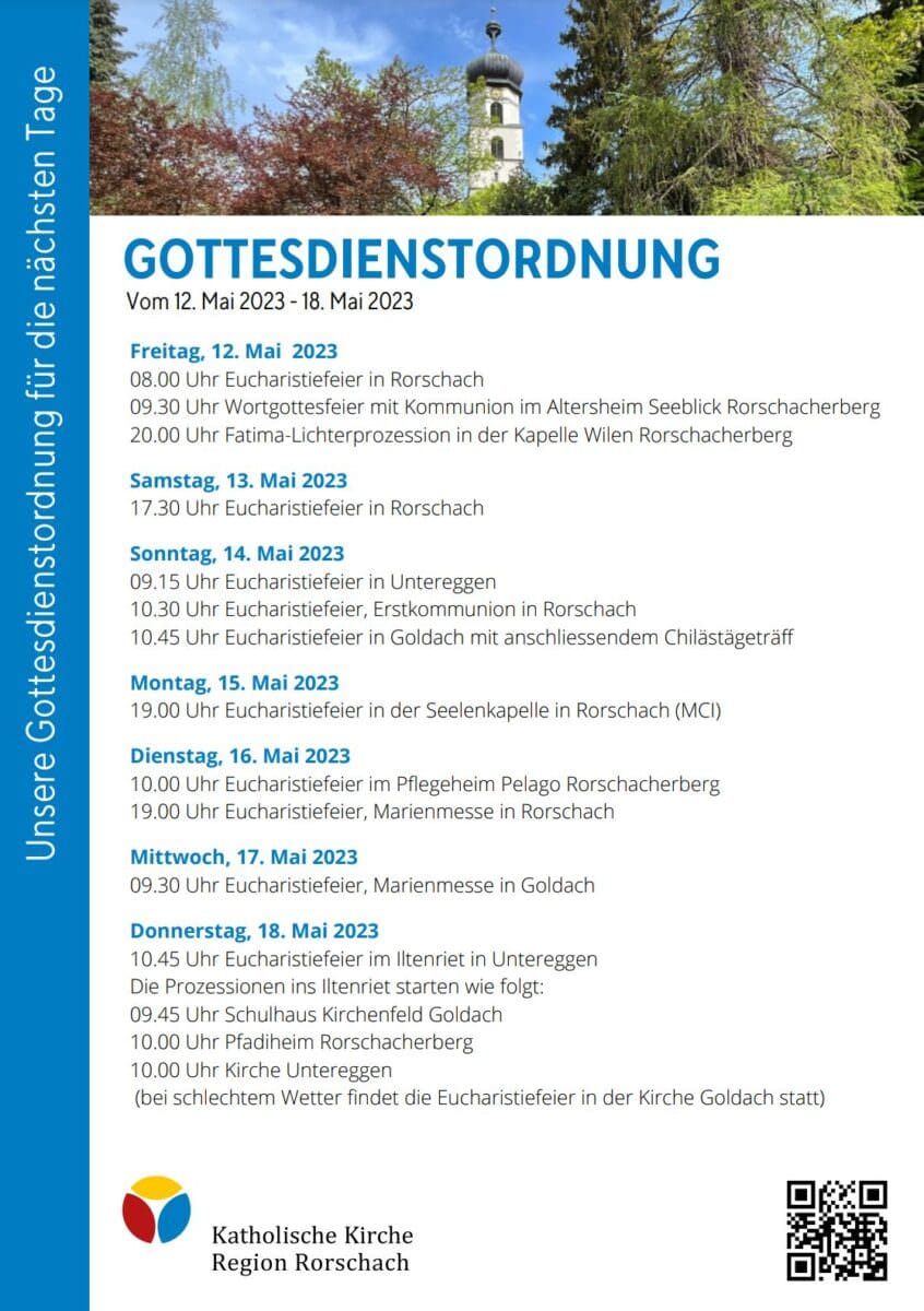 Gottesdienstordnung der KKRR für die nächsten TageThemen:Kath. RorschachKulturPartnerRegionRorschach 12. Mai 2023 - 05:20Gilt ab heute Freitag bis kommenden Donnerstag (Auffahrt), 18. Mai 2023. Mehr Informationen finden Interessierte immer auch hier und hier.Teilen mit: Einen Link per E-Mail an einen Freund senden (Wird in neuem Fenster geöffnet) E-Mail Drucken (Wird in neuem Fenster geöffnet) Drucken Auf Facebook teilen (Wird in neuem Fenster geöffnet) Facebook Auf X teilen (Wird in neuem Fenster geöffnet) X Auf WhatsApp teilen (Wird in neuem Fenster geöffnet) WhatsApp Gefällt mir:Gefällt mir Wird geladen …Newsletter abonnieren Bitte dieses Feld leer lassenBitte wähle, ob Du über jeden neuen Beitrag sofort oder lieber jeden Morgen gegen 9 Uhr eine Zusammenfassung der neusten Beiträge erhalten möchtest.Liste(n) auswählen: Neues vom Echo (Zusammenfassung) Neues vom Echo (Sofortbenachrichtigung) Dieses Feld wird benötigt.Prüfen Sie Ihren Posteingang und den Spamordner, um Ihr Abonnement zu bestätigen.