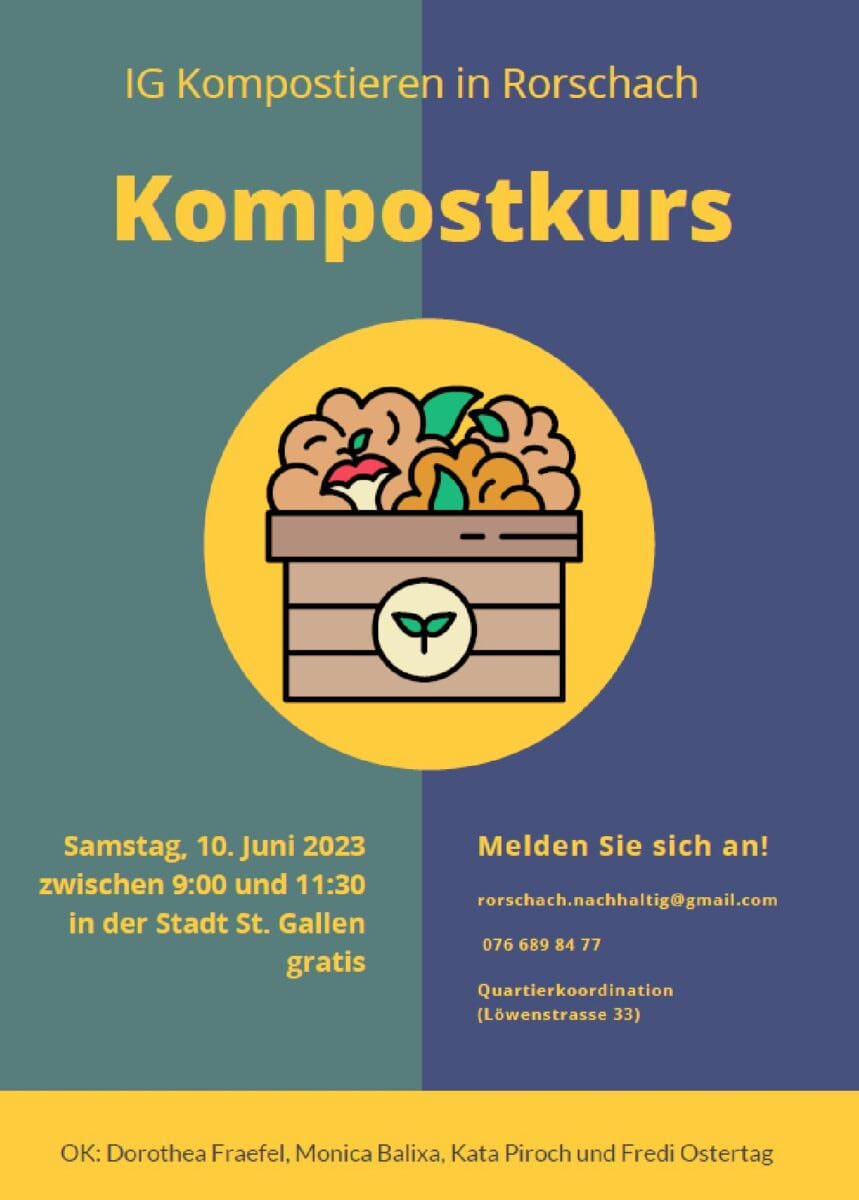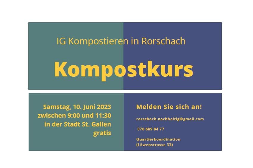 Interessierte können sich jetzt für den Kompostkurs anmelden, der am Samstag, 10. Juni 2023 in St. Gallen stattfindet. Die weiteren Informationen folgen nach erfolgter Anmeldung. Mit der „IG Kompostieren in Rorschach“ kann man wie folgt Kontakt aufnehmen: WhatsApp Gruppe über 076 689 84 77 und via Facebook und Instagram. Oder per Mail.