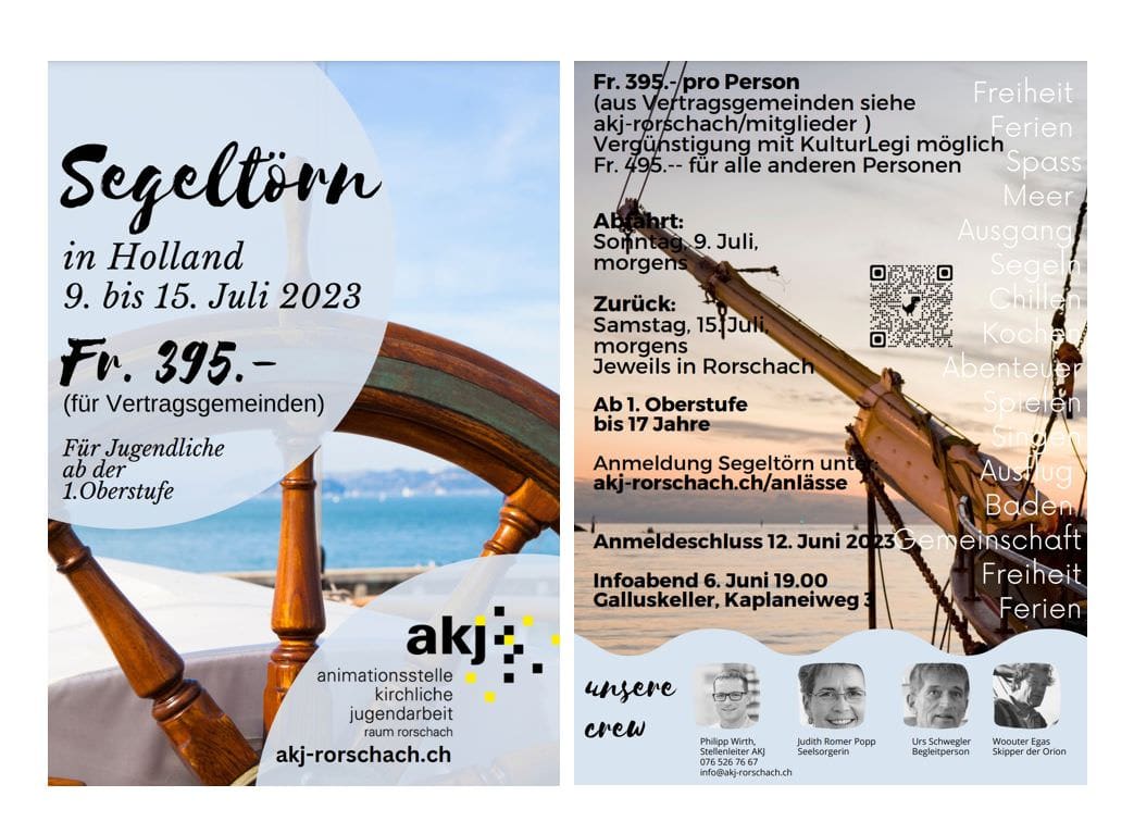 Infoabend zum Segeltörn ist am nächsten DienstagThemen:Kath. RorschachKulturPartnerRorschach 2. Juni 2023 - 05:10Mehr Infos finden interessierte Jugendliche ab der 1. Oberstufe auch hier. Und auf den Flyern unten. Teilen mit: Einen Link per E-Mail an einen Freund senden (Wird in neuem Fenster geöffnet) E-Mail Drucken (Wird in neuem Fenster geöffnet) Drucken Auf Facebook teilen (Wird in neuem Fenster geöffnet) Facebook Auf X teilen (Wird in neuem Fenster geöffnet) X Auf WhatsApp teilen (Wird in neuem Fenster geöffnet) WhatsApp Gefällt mir:Gefällt mir Wird geladen …Newsletter abonnieren Bitte dieses Feld leer lassenBitte wähle, ob Du über jeden neuen Beitrag sofort oder lieber jeden Morgen gegen 9 Uhr eine Zusammenfassung der neusten Beiträge erhalten möchtest.Liste(n) auswählen: Neues vom Echo (Zusammenfassung) Neues vom Echo (Sofortbenachrichtigung) Dieses Feld wird benötigt.Prüfen Sie Ihren Posteingang und den Spamordner, um Ihr Abonnement zu bestätigen.
