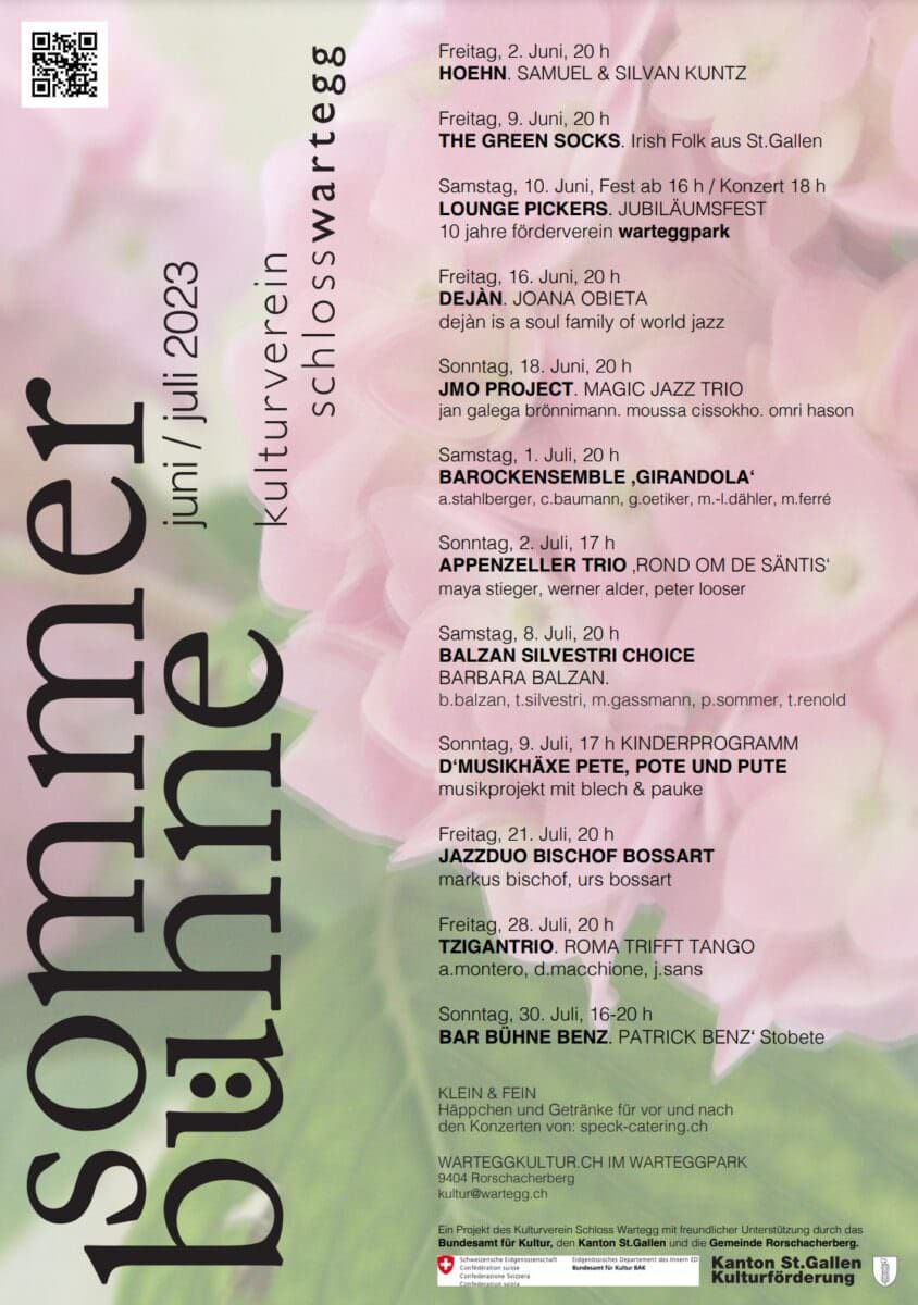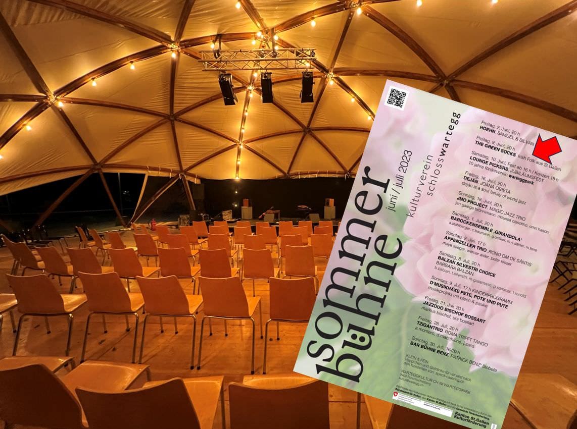 Während zweier Monate finden auf der Sommerbühne Konzerte verschiedenster Formationen statt. Für das leibliche Wohl bei den Abendveranstaltungen sorgt das Team von Luzia Hebel-Kappenthuler (speck-catering.ch). In ihrer kultigen Bar beim Zelt bietet es feinste Häppchen und Getränke an. Geöffnet ist die Bar 1h vor bis 1h nach den Anlässen.