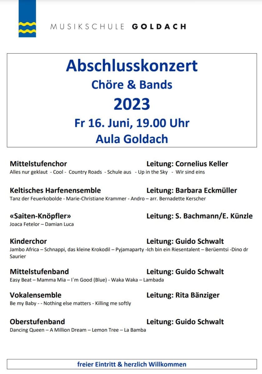 Mit dem traditionellen Abschlusskonzert der Musikschule in der Aula Goldach kommenden Freitag, 16. Juni 2023, 19:00 Uhr (freier Eintritt) beenden die Chöre und die Mittelstufenband ihre Konzerttätigkeit im zu Ende gehenden Schuljahr. Auch das „keltische Harfen Ensemble“ von Barbara Eckmüller ist dabei. Der Mittelstufenchor unter der Leitung von Cornelius Keller eröffnet das Konzert mit einigen modernen Liedern. Die Mittelstufenband und der Kinderchor mit vielen Solisten stehen unter der Leitung von Guido Schwalt und werden mit ihren Stücken und Liedern sicher auch zu begeistern wissen. Einen besonderen Auftritt haben die «Saiten-Knöpfler» der Musiklehrpersonen Simone Bachmann und Elfi Künzle. Auch das Vokalensemble von Rita Bänziger ist zu hören. Mit diesem Konzert verabschieden sich mit Cornelius Keller, Elfi Künzle und Guido Schwalt gleich drei langjährige Musikehrpersonen in die Pension. Mit Frau Mariel Zambellis (übernimmt beide Chöre) und dem neuen Musikschulleiter Dominik Müller (übernimmt beide Bands) ist die Nachfolge bestens geregelt! (Text/Plakat (pd msg gs)