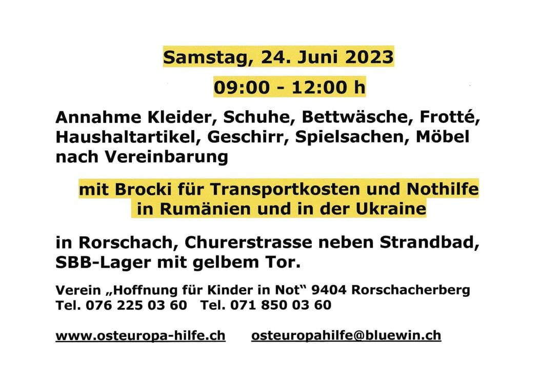Das Rorschacher Echo hat am Dienstag darauf hingewiesen, dass Astrid Eisenring den nächsten Sammeltag durchführt. Dabei wurde völlig vergessen, das genaue Datum aufzuführen. Der Sammeltag findet diesen Samstag, 24. Juni 2023, von 9 bis 12 Uhr in ihrem Depot an der Churerstrasse (gelbes Tor) statt.