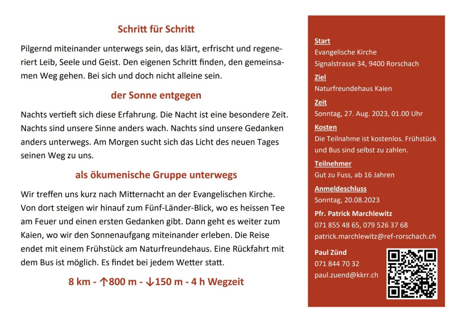 Nachtwanderungen haben ihren ganz speziellen ReizThemen:Kath. RorschachKulturPartnerRef. RorschachRorschach 22. Juni 2023 - 05:10Start ist in Rorschach. Ziel ist das Naturfreundehaus Kaien. Details findet man unten. Teilen mit: Einen Link per E-Mail an einen Freund senden (Wird in neuem Fenster geöffnet) E-Mail Drucken (Wird in neuem Fenster geöffnet) Drucken Auf Facebook teilen (Wird in neuem Fenster geöffnet) Facebook Auf X teilen (Wird in neuem Fenster geöffnet) X Auf WhatsApp teilen (Wird in neuem Fenster geöffnet) WhatsApp Gefällt mir:Gefällt mir Wird geladen …Newsletter abonnieren Bitte dieses Feld leer lassenBitte wähle, ob Du über jeden neuen Beitrag sofort oder lieber jeden Morgen gegen 9 Uhr eine Zusammenfassung der neusten Beiträge erhalten möchtest.Liste(n) auswählen: Neues vom Echo (Zusammenfassung) Neues vom Echo (Sofortbenachrichtigung) Dieses Feld wird benötigt.Prüfen Sie Ihren Posteingang und den Spamordner, um Ihr Abonnement zu bestätigen.