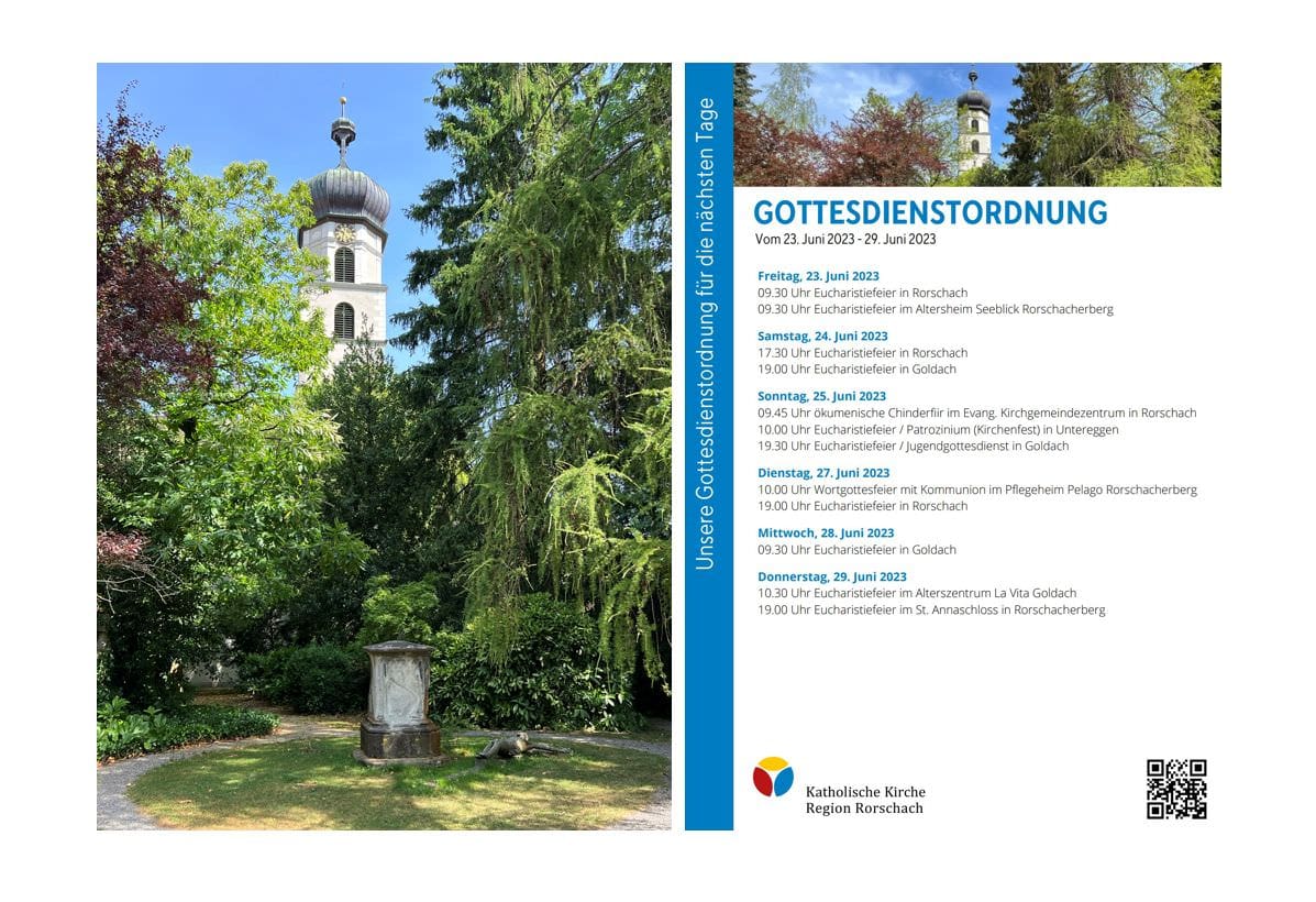 Gottesdienstordnung der KKRR für die nächsten TageThemen:Kath. RorschachKulturPartnerRegionRorschach 23. Juni 2023 - 05:15Gilt ab heute Freitag bis kommenden Donnerstag, 29. Juni 2023. Mehr Informationen finden Interessierte immer auch hier und hier. Teilen mit: Einen Link per E-Mail an einen Freund senden (Wird in neuem Fenster geöffnet) E-Mail Drucken (Wird in neuem Fenster geöffnet) Drucken Auf Facebook teilen (Wird in neuem Fenster geöffnet) Facebook Auf X teilen (Wird in neuem Fenster geöffnet) X Auf WhatsApp teilen (Wird in neuem Fenster geöffnet) WhatsApp Gefällt mir:Gefällt mir Wird geladen …Newsletter abonnieren Bitte dieses Feld leer lassenBitte wähle, ob Du über jeden neuen Beitrag sofort oder lieber jeden Morgen gegen 9 Uhr eine Zusammenfassung der neusten Beiträge erhalten möchtest.Liste(n) auswählen: Neues vom Echo (Zusammenfassung) Neues vom Echo (Sofortbenachrichtigung) Dieses Feld wird benötigt.Prüfen Sie Ihren Posteingang und den Spamordner, um Ihr Abonnement zu bestätigen.