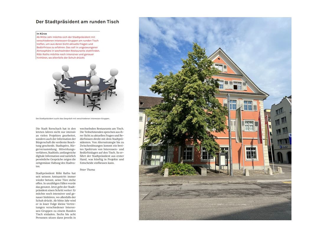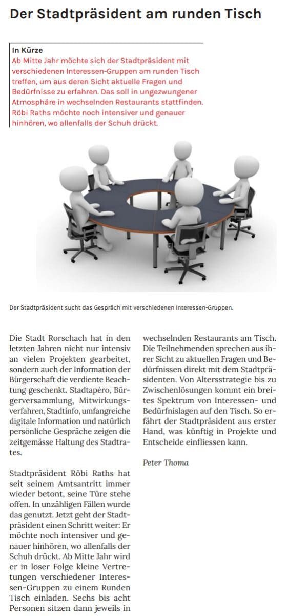 Ab Mitte Jahr möchte sich der Stadtpräsident mit verschiedenen Interessen-Gruppen am runden Tisch treffen, um aus deren Sicht aktuelle Fragen und Bedürfnisse zu erfahren. Das soll in ungezwungener Atmosphäre in wechselnden Restaurants stattfinden. Röbi Raths möchte noch intensiver und genauer hinhören, wo allenfalls der Schuh drückt. Der ganze Bericht ist in den soeben verteilten Rorschacher Stadtinfos auf Seite 11 zu finden.